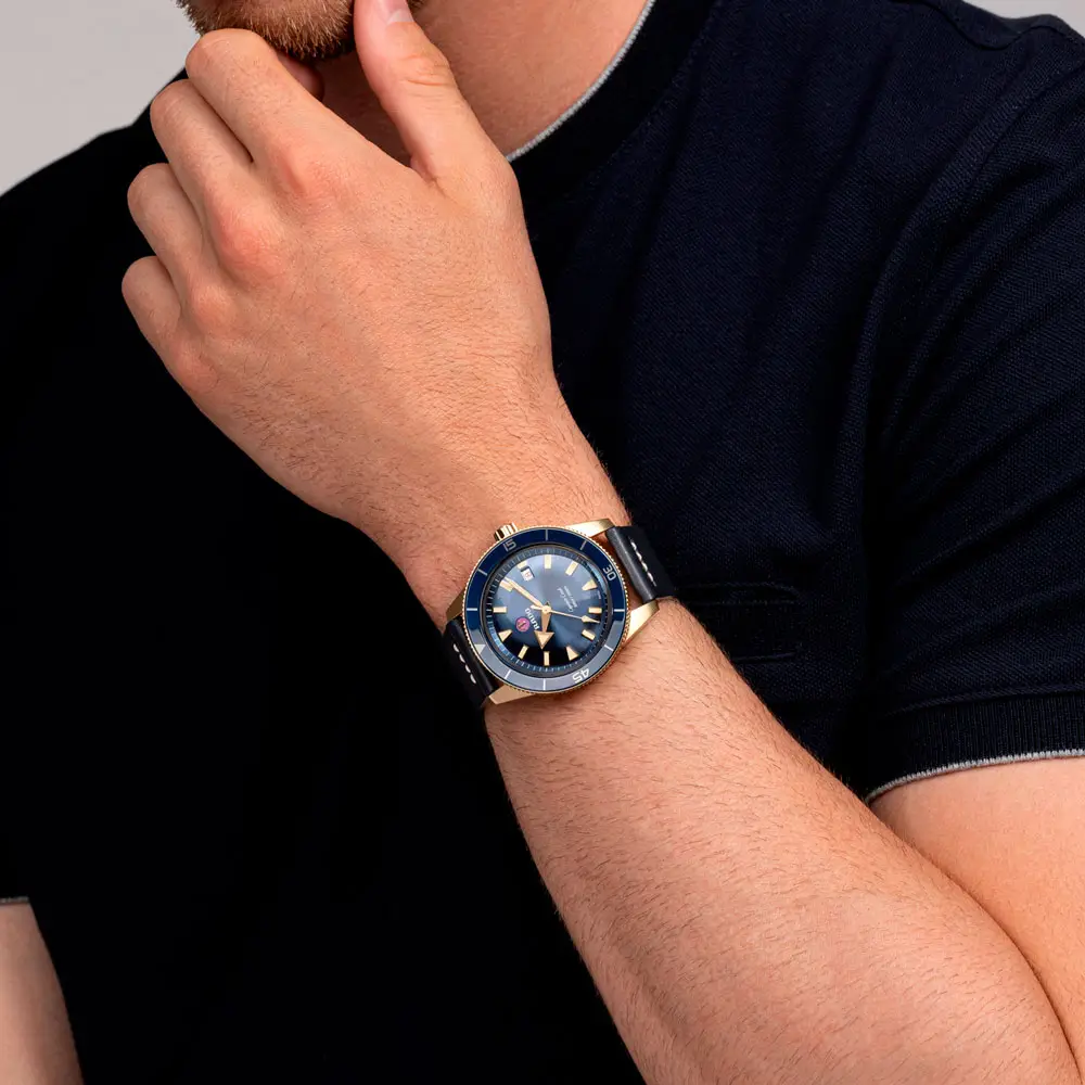 Rado Captain Cook Automatic Bronze R32504205 сочетает в себе классический стиль дайверских часов и современное швейцарское мастерство в эффектном бронзовом исполнении. Корпус диаметром 42 мм из бронзы CuAl со временем покрывается естественной патиной, придавая каждому экземпляру индивидуальность. Синий циферблат украшен золотыми стрелками и метками с люминесцентным покрытием, а поворотный безель из высокотехнологичной керамики добавляет прочности и спортивного характера.