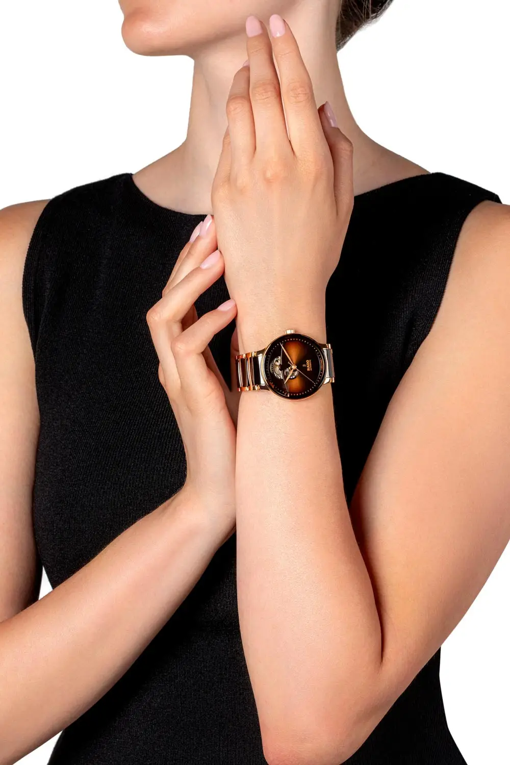 Коричневый циферблат с открытым сердцем открывает вид на точный механизм с автоматическим подзаводом и запасом хода около 80 часов. Его защищает сапфировое стекло, обеспечивающее максимальную читаемость и устойчивость. Коричневый браслет из комбинации керамики, нержавеющей стали и покрытия из розового золота оснащен раскладывающейся застежкой для безопасного и удобного ношения.