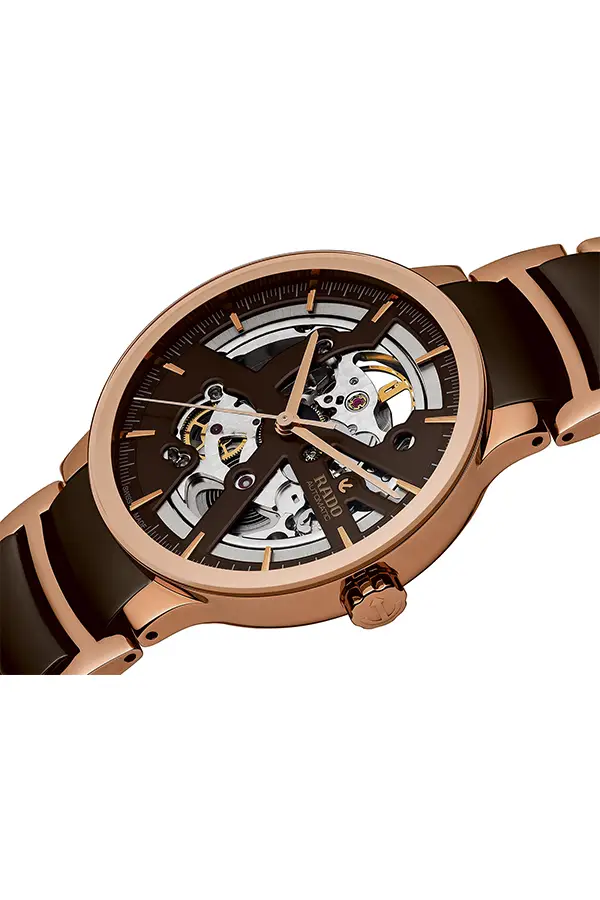 Rado Centrix Automatic Open Heart R30181312 — воплощение гармонии технической точности и утончённого дизайна. Эта модель поражает с первого взгляда своим открытым скелетонизированным циферблатом, через который можно наблюдать сердце часов — механизм с автоподзаводом, позволяющий в реальном времени оценить мастерство часовых мастеров.