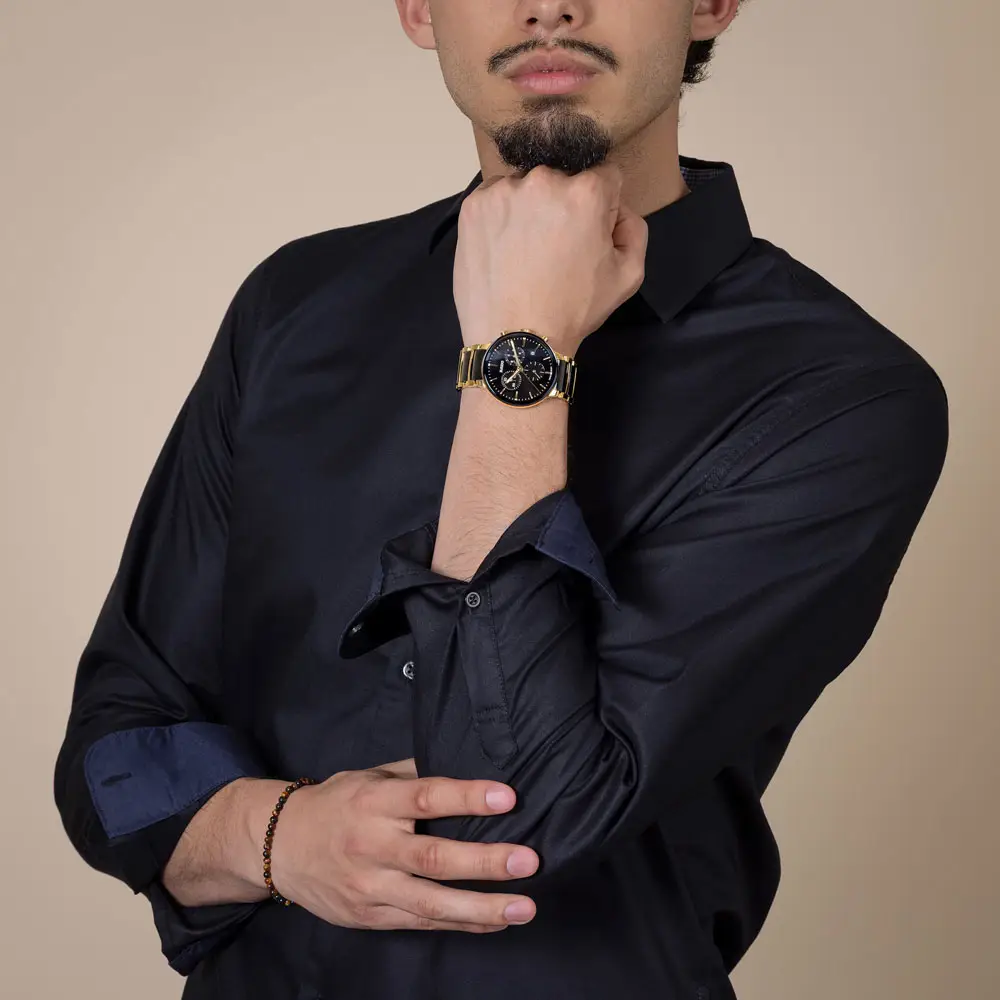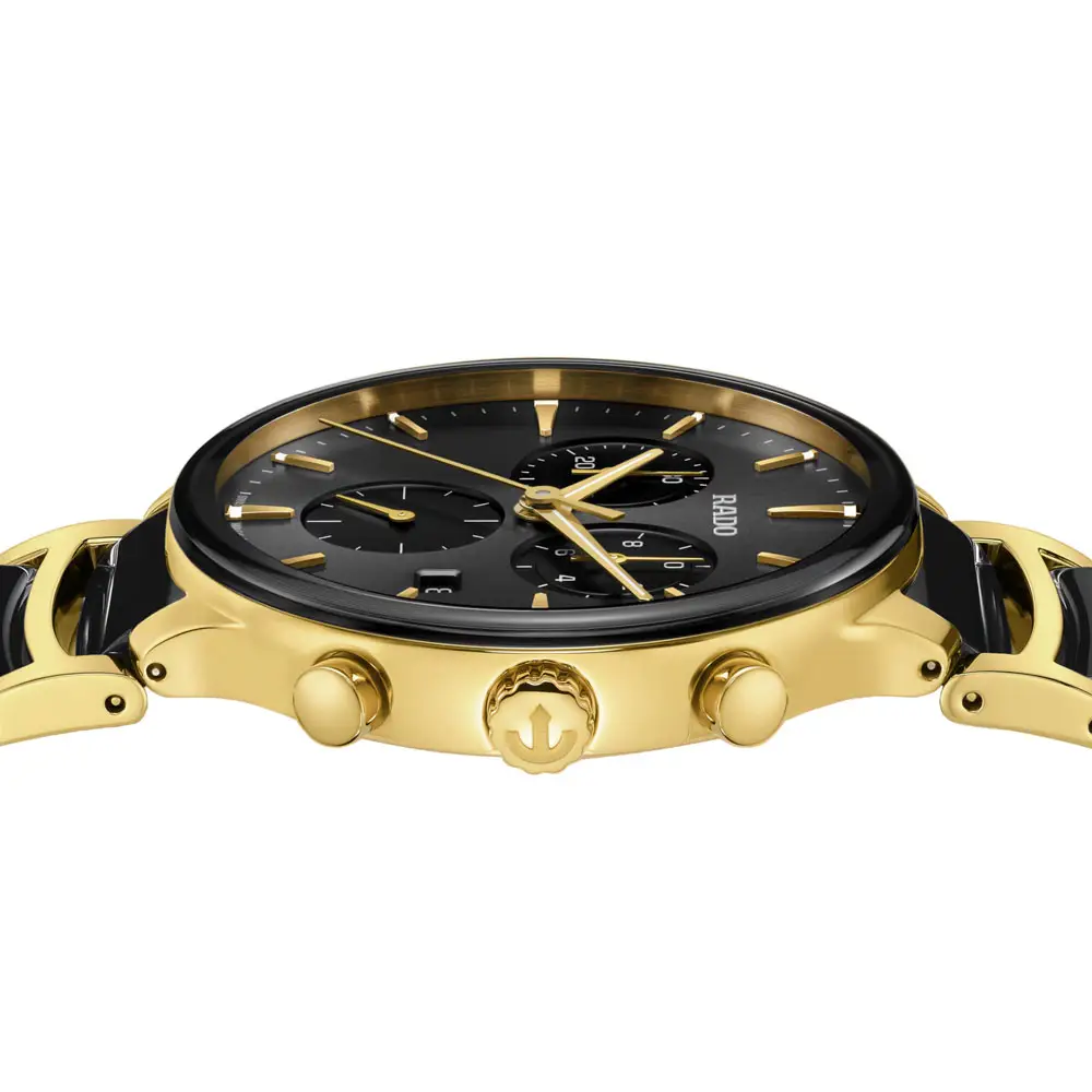 Хронограф Rado Centrix сочетает в себе спортивную функциональность и элегантный дизайн. Корпус диаметром 41 мм из нержавеющей стали с PVD-покрытием золотого тона дополнен мягко изогнутым сапфировым стеклом с антибликовым покрытием, которое защищает часы от царапин. Черный циферблат sunray с золотистыми индексами и дополнительными циферблатами выглядит современно, а также отличается высокой разборчивостью. Водонепроницаемость до 50 метров обеспечивает достаточную защиту для повседневного ношения.
