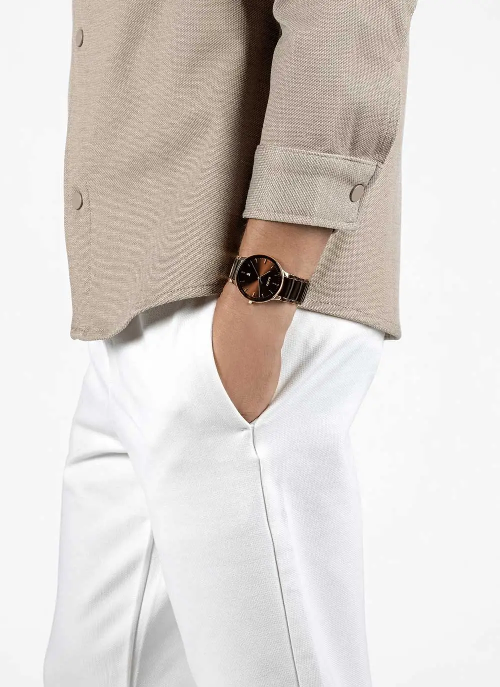 Роскошные часы Rado Centrix Quartz R30023302 сочетают вечную элегантность и техническое совершенство. Круглый корпус 39,5 мм из нержавеющей стали с розовым PVD-покрытием придаёт модели выразительный, современный вид. Плавные переходы между керамическим безелем и коричневым циферблатом с тонким солнечным узором усиливают глубину дизайна. Циферблат дополнен окном даты на 3 часах и защищён сапфировым стеклом от царапин.