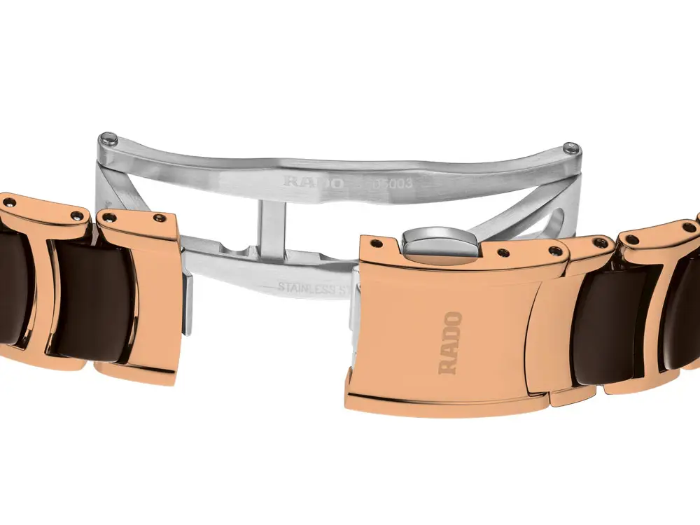 Браслет из нержавеющей стали с вставками из розово-золотой керамики идеально сочетается с корпусом и обеспечивает комфорт при ношении. Rado Centrix R30024302 — это символ современной роскоши, швейцарского мастерства и утончённой универсальности, подходящий для любого случая.