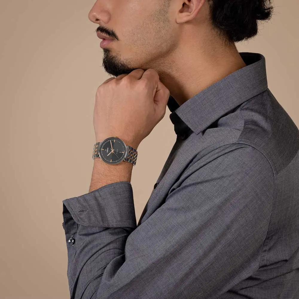 Серый аналоговый циферблат отличается простотой, читаемостью и элегантностью – он прекрасно сочетается с двухцветным стальным браслетом, который оснащён раскладывающейся застежкой для комфортной и безопасной посадки.