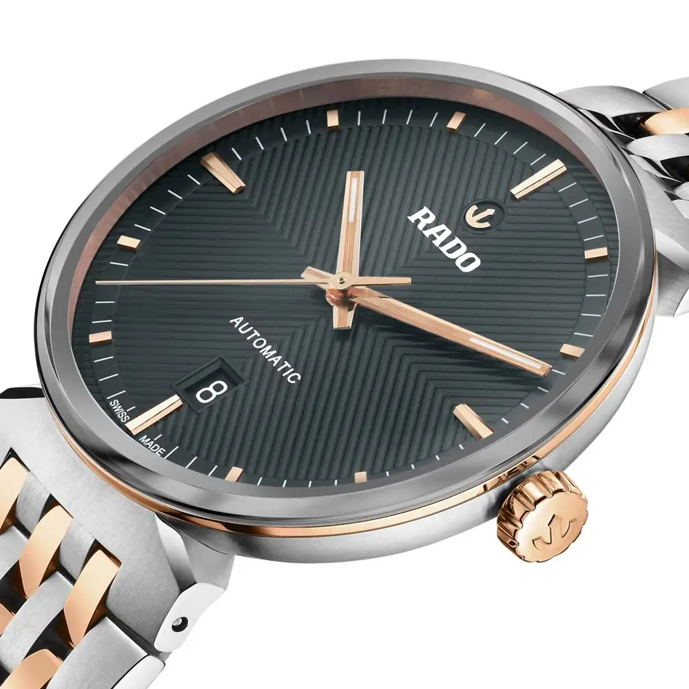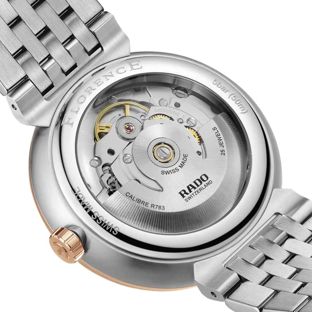 Rado Florence Automatic R48903103 сочетает в себе элегантность классического дизайна с современным исполнением, характерным для коллекции Florence. Круглый корпус диаметром 39 мм изготовлен из высококачественной нержавеющей стали с розово-золотыми акцентами, придающими часам изысканный и вневременной вид.