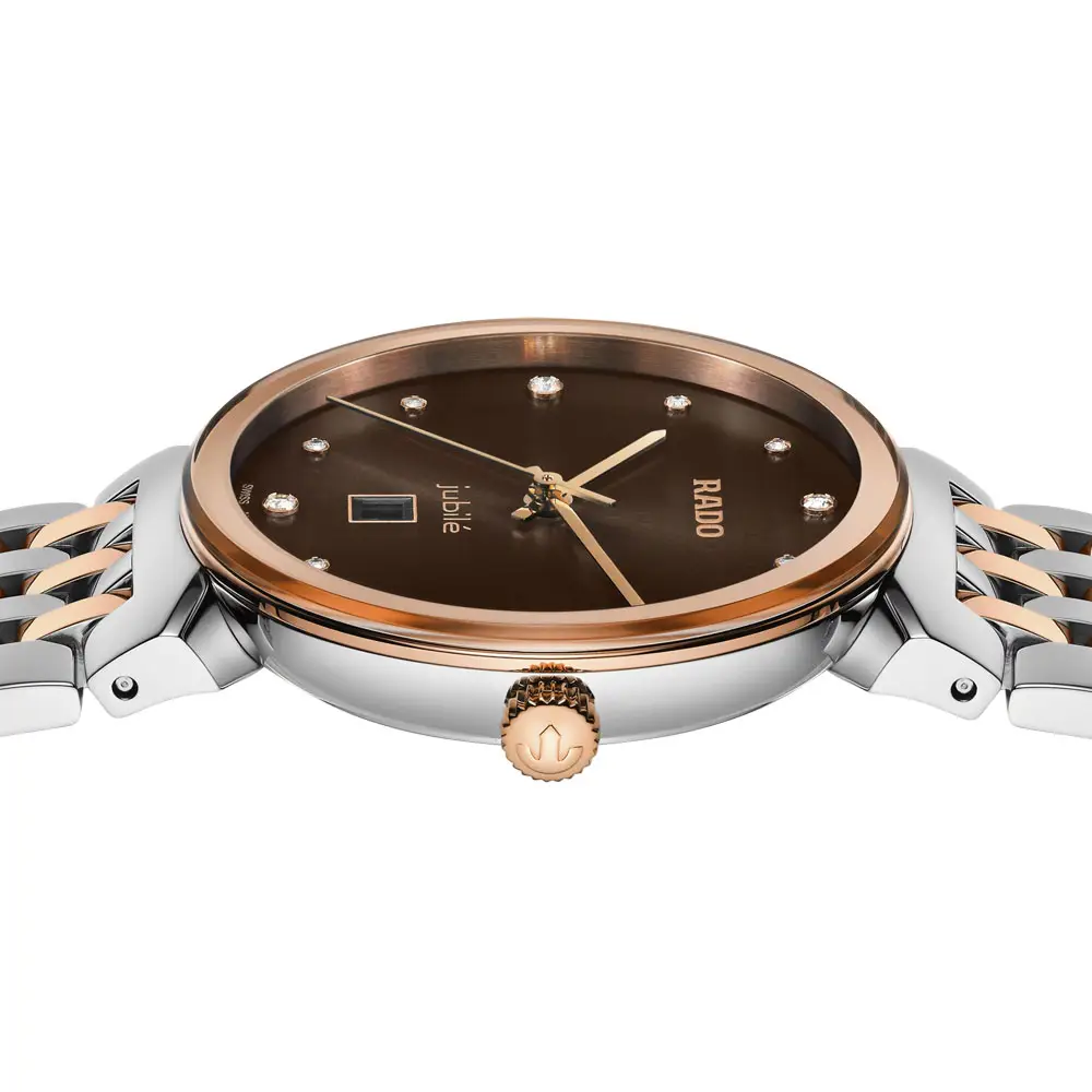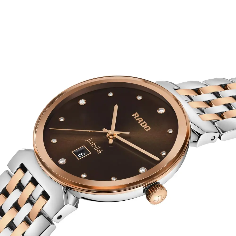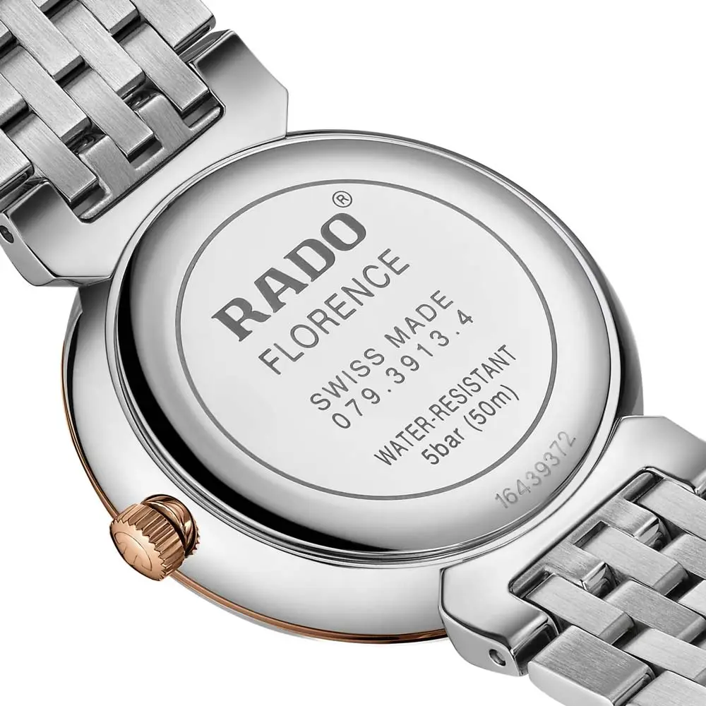 Rado Florence Diamonds R48913763 — изысканное сочетание классического стиля и современного люкса, созданное для женщин, ценящих утончённые детали. Модель оснащена круглым корпусом из нержавеющей стали диаметром 30 мм с элегантным обрамлением из розового золота, придающим часам женственный акцент.