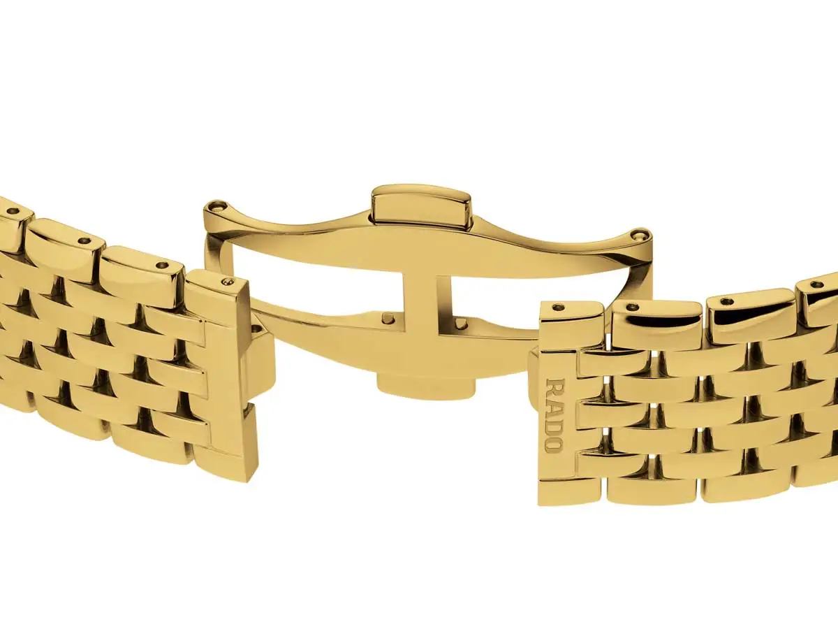 Rado Florence Diamonds R48914703 сочетает в себе классическую элегантность, точную отделку и роскошные детали. Круглый корпус диаметром 38 мм выполнен из нержавеющей стали с позолотой, идеально сочетающейся с элегантным стальным браслетом золотого цвета. Чёрный циферблат, украшенный часовыми метками из бриллиантов, подчёркивает эксклюзивный стиль модели.