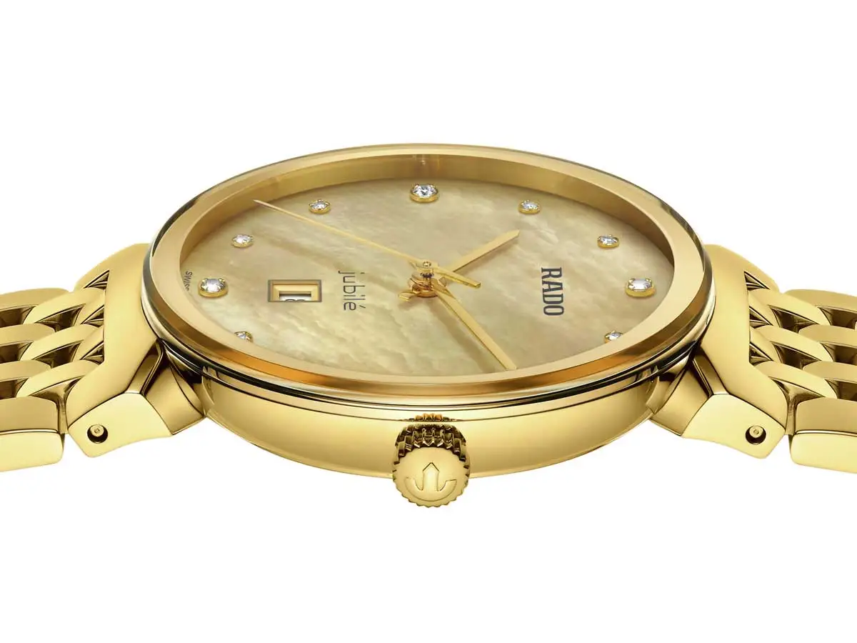 Rado Florence Diamonds R48915903 воплощает в себе элегантность, женственность и швейцарскую точность в гармоничном сочетании. Корпус из нержавеющей стали диаметром 30 мм с жёлтым PVD-покрытием плавно переходит в браслет из стали в том же оттенке, создавая изысканный образ. Перламутровый циферблат, украшенный 12 бриллиантами, придаёт часам утончённый блеск, а фацетированное сапфировое стекло обеспечивает ясность и защиту от царапин.