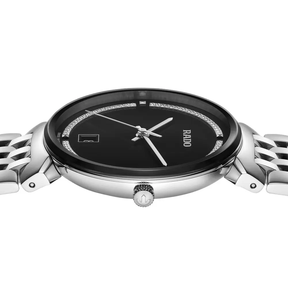 Rado Florence R48912163 привносит в повседневную жизнь элегантность классического стиля и высокое качество швейцарского исполнения. Круглый корпус из нержавеющей стали диаметром 38 мм в сочетании с черным аналоговым циферблатом придаёт часам сдержанный, но выразительный внешний вид – уместный как в официальной, так и в повседневной обстановке.