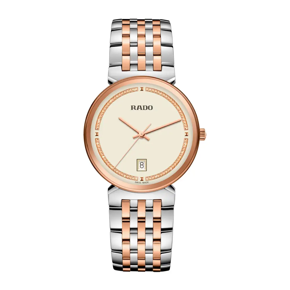 Rado Florence R48912403 сочетает в себе классическую элегантность и современное исполнение, характерные для бренда Rado. Модель оснащена круглым корпусом диаметром 38 мм, выполненным из нержавеющей стали, с безелем в цвете розового золота, который придаёт утончённый контраст.