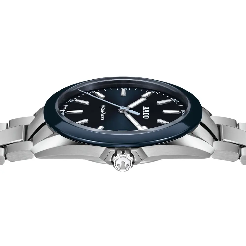 Rado HyperChrome 41,5 мм впечатляет своей спортивной элегантностью, прочностью и чистым дизайном. Корпус из нержавеющей стали дополнен массивным люнетом из высокотехнологичной керамики, которая обеспечивает исключительную устойчивость к царапинам. Циферблат темно-синего оттенка с эффектом солнечных лучей дополнен стрелками и индексами с люминесценцией Super-LumiNova®, причем секундная стрелка светится зеленым, а остальные элементы - синим. Часы защищены сапфировым стеклом с антибликовым покрытием и водонепроницаемы до  ;150 метров.