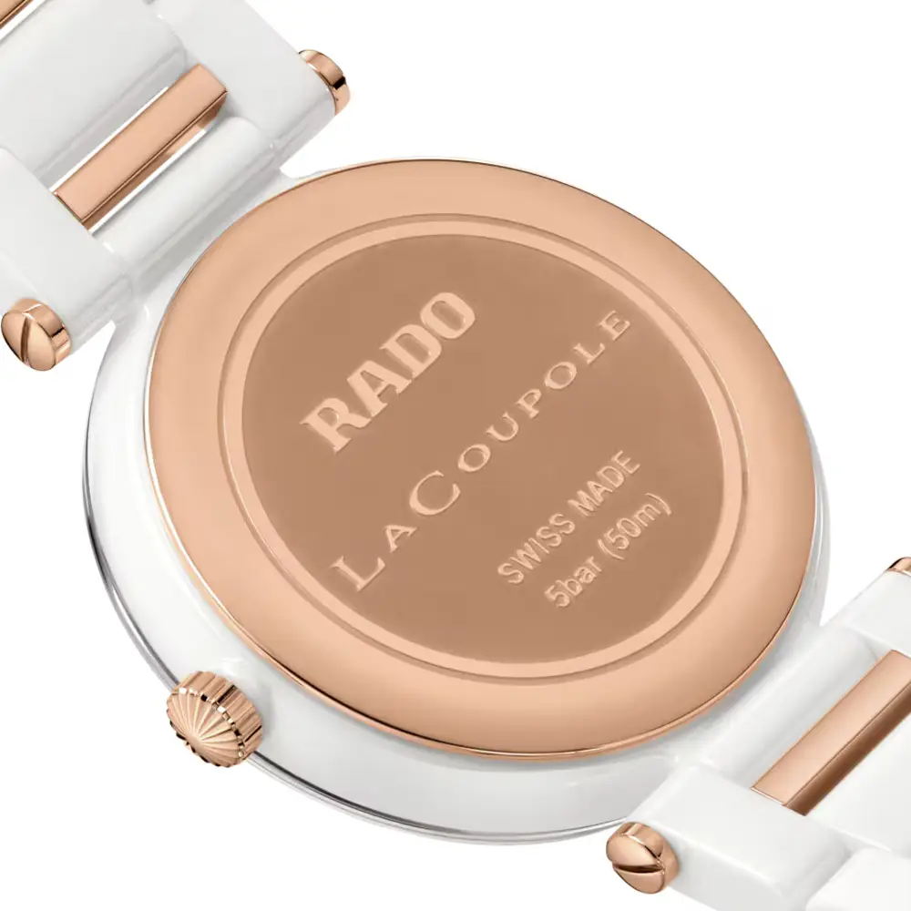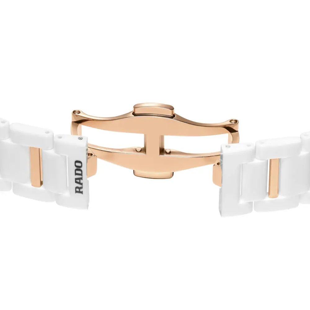 Серебристый циферблат украшен двенадцатью бриллиантовыми метками, которые сверкают под сапфировым стеклом при каждом движении запястья. Контраст между белой керамикой и розовым золотом придает модели женственность и изысканность, а лаконичные стрелки отражают стиль Rado.
