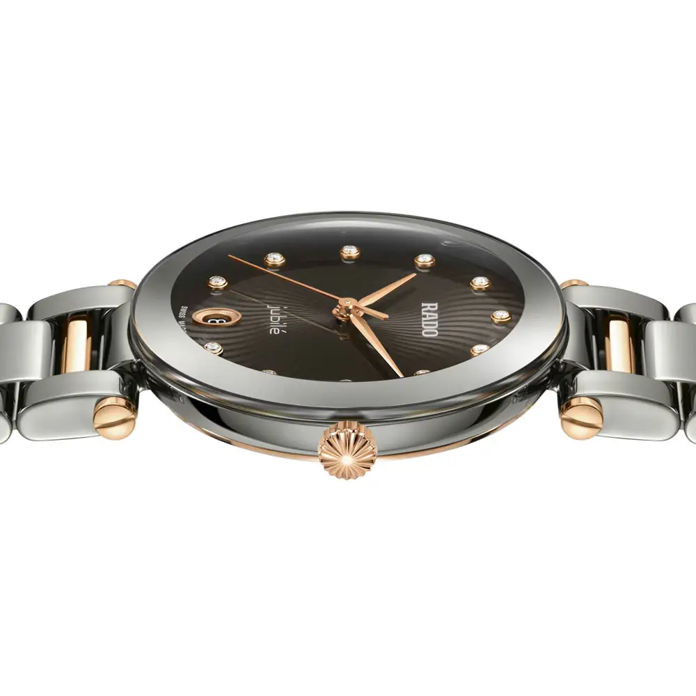 Rado LaCoupole Diamonds R22241703 - женские часы, сочетающие в себе современные технологии с элегантностью и женской утонченностью. 31-миллиметровый корпус из плазменной высокотехнологичной керамики отличается исключительной прочностью, блеском и легкостью. Безель корпуса украшен деталями с PVD-покрытием из розового золота, а выпуклое сапфировое стекло с антибликовой обработкой защищает циферблат с мелкой текстурой.