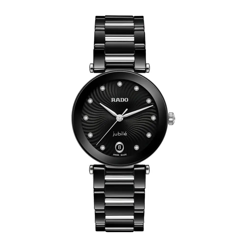 Rado LaCoupole Diamonds R22243703 - воплощение элегантной роскоши и дизайна вне времени. Корпус диаметром 31 мм изготовлен из глянцевой черной высокотехнологичной керамики и дополнен выразительным куполообразным сапфировым стеклом с антибликовой обработкой. Черный циферблат с волнистым рельефом украшен 11 бриллиантовыми индексами Top Wesselton, которые придают часам тонкий и изысканный блеск. Водонепроницаемость до 50 м делает часы идеальными для повседневного ношения.