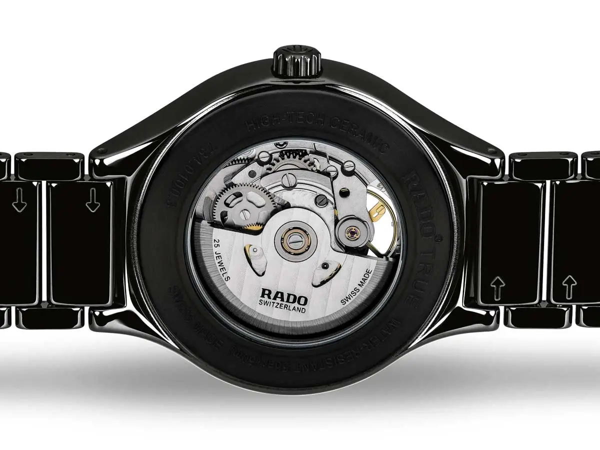 Rado True Automatic Open Heart R27100162 сочетает в себе современную эстетику и техническое совершенство. Корпус диаметром 40 мм из высокотехнологичной керамики с элементами из титана и PVD отличается лёгкостью, гипоаллергенностью и устойчивостью к царапинам. Скелетонизированный циферблат с открытым окном („open heart“) позволяет наблюдать работу механизма, а сапфировое стекло с антибликовым покрытием обеспечивает прозрачность и защиту.