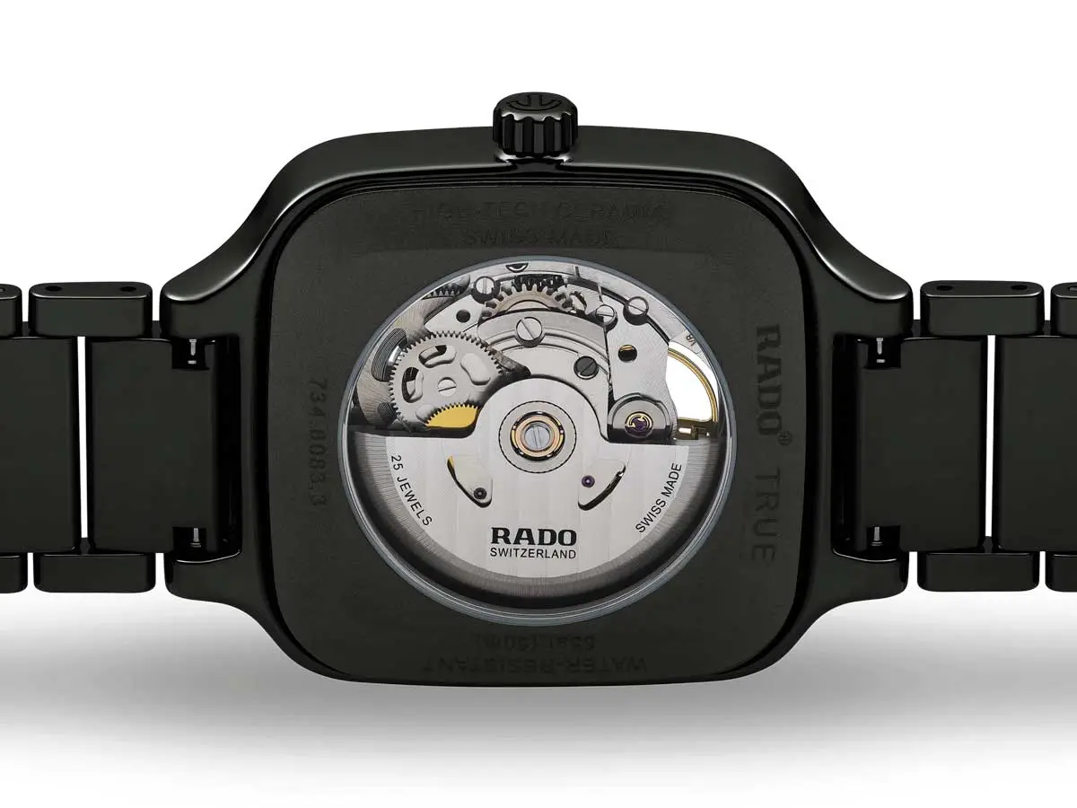 Rado True Square Automatic Open Heart R27086162 представляет современное прочтение культового квадратного дизайна марки Rado. Корпус диаметром 38 мм из высокотехнологичной керамики лёгкий, гипоаллергенный и устойчивый к царапинам. Элегантный чёрный скелетонизированный циферблат с открытым окном («open heart») позволяет наблюдать за движением механизма, а сапфировое стекло обеспечивает отличную защиту и прозрачность.