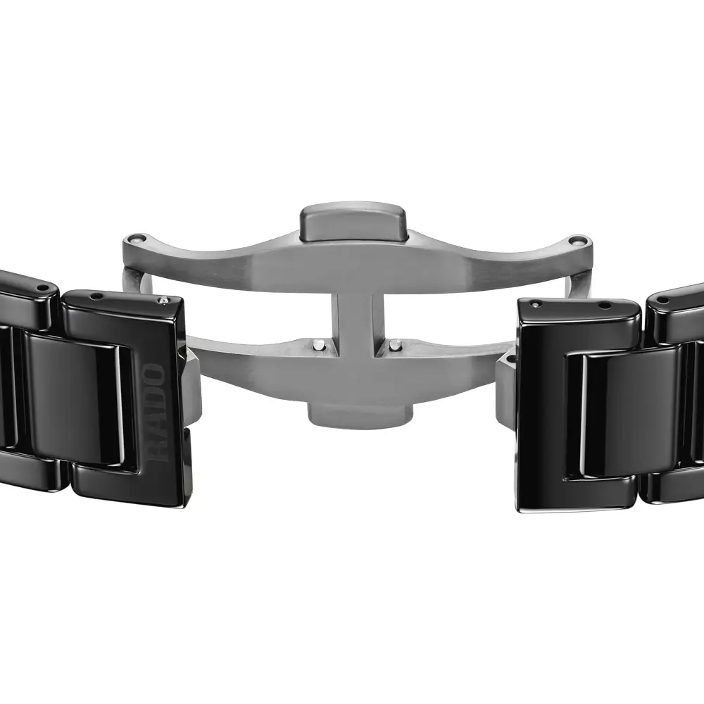 Элегантный чёрный аналоговый циферблат выглядит стильно и современно, а сапфировое стекло обеспечивает отличную защиту от повреждений и царапин. Керамический чёрный браслет дополняет общий дизайн и оснащён раскладывающейся застежкой для максимального комфорта.
