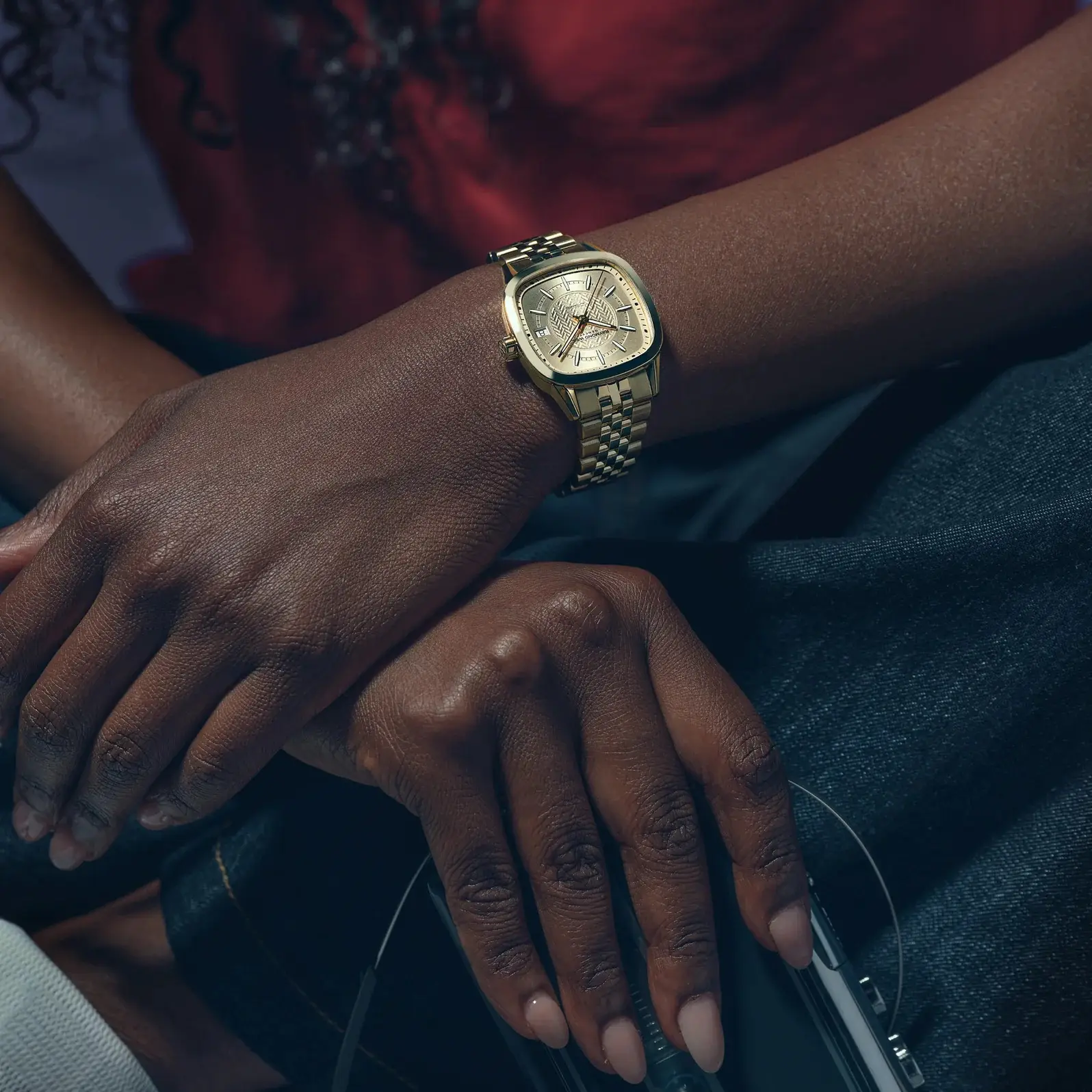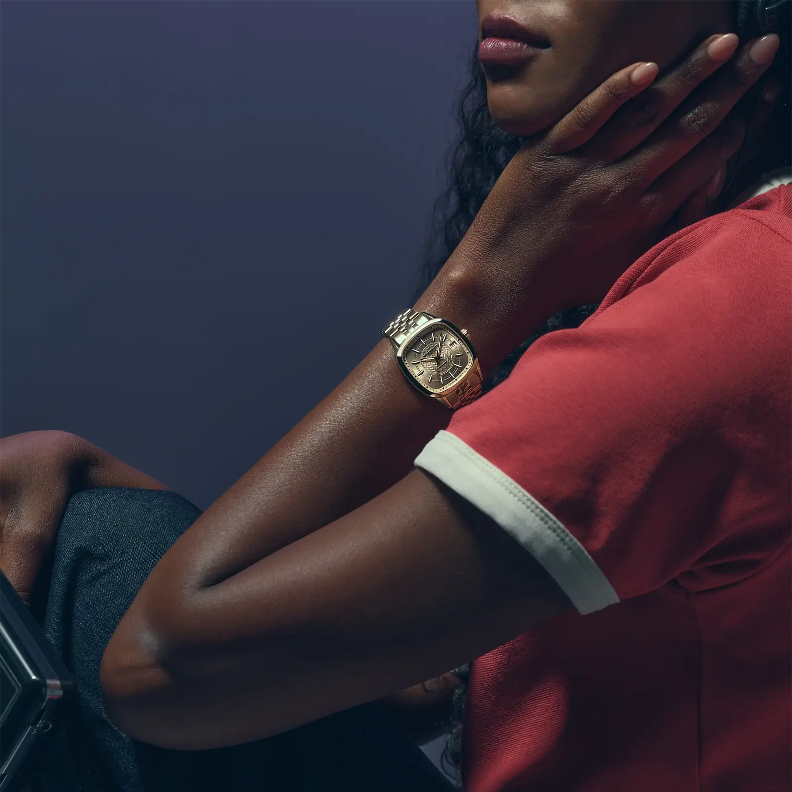 Стальной браслет с позолоченными звеньями и раскладывающаяся застёжка с двойным нажимом завершают образ. Толщина всего 9,3 мм делает модель удобной в носке и универсальной – как для повседневного стиля, так и для особых событий.