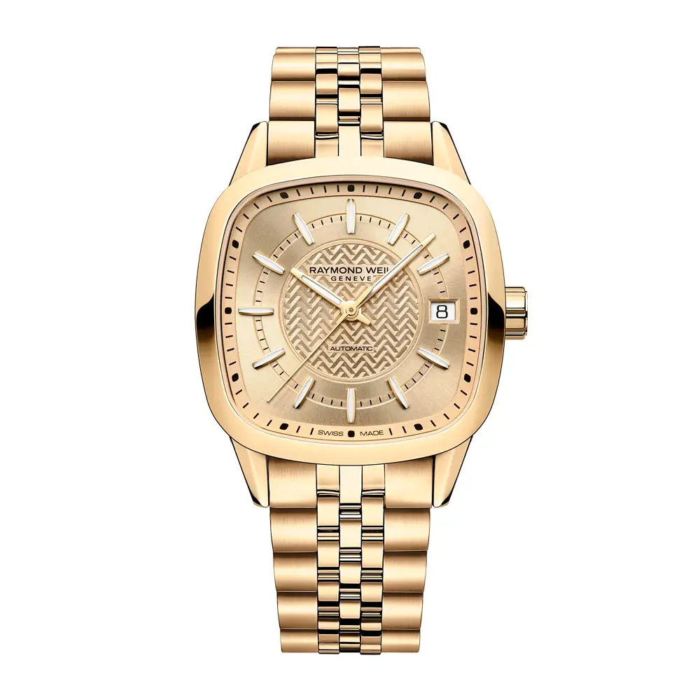 Raymond Weil Freelancer 2490-P-10051 сочетает в себе традиционное швейцарское мастерство и современный стиль. Корпус 34×34 мм в форме cushion выполнен из стали с жёлтым PVD-покрытием и дополнен шампань-циферблатом с изысканным узором W guilloché. Стрелки и метки с Super-Luminova® обеспечивают отличную читаемость.