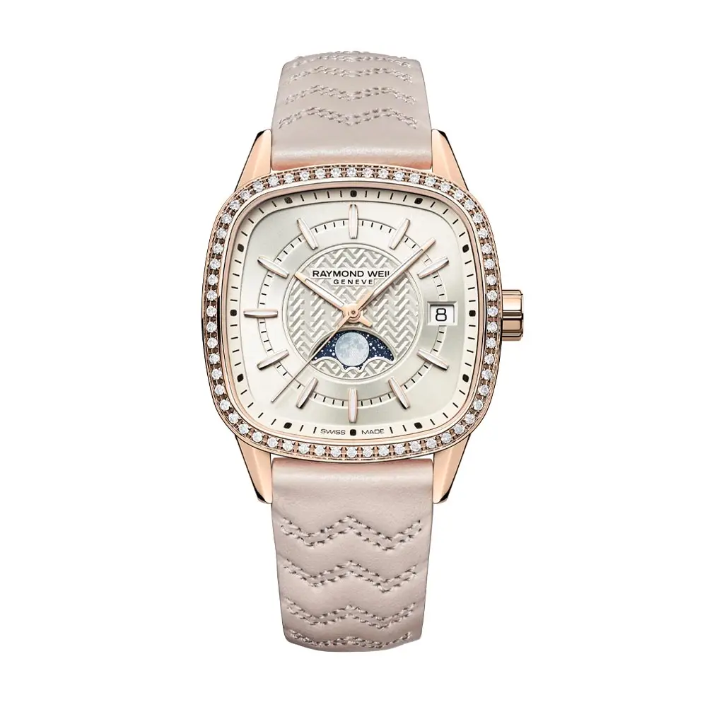 Часы Raymond Weil Freelancer Ladies Moon Phase выделяются элегантным дизайном и поэтическими деталями. Корпус размером 34 × 34 мм имеет мягко закругленную форму и изготовлен из нержавеющей стали с розовым PVD-покрытием. Кремовый перламутровый циферблат украшен буквой "W", фазой Луны, вдохновленной NASA, накладными индексами и стрелками из розового золота. Выпуклое сапфировое стекло подчеркивает ретро-модернистский характер модели.