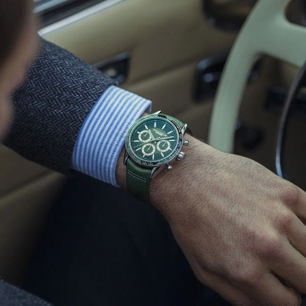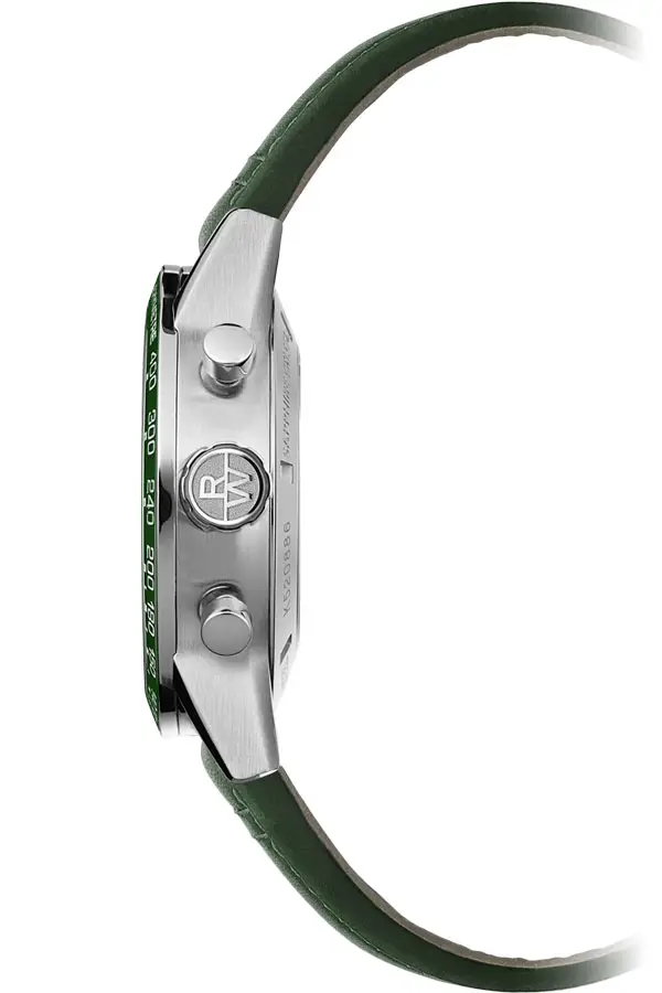 Корпус из нержавеющей стали диаметром 43,5 мм сочетает полированные и сатинированные поверхности, а зелёный керамический безель с тахиметрической шкалой придаёт часам функциональность и динамичный характер. Зелёный циферблат оснащён тремя счётчиками хронографа и датой между 4 и 5 часами, а стрелки и метки с покрытием Super-LumiNova® обеспечивают отличную читаемость в темноте.