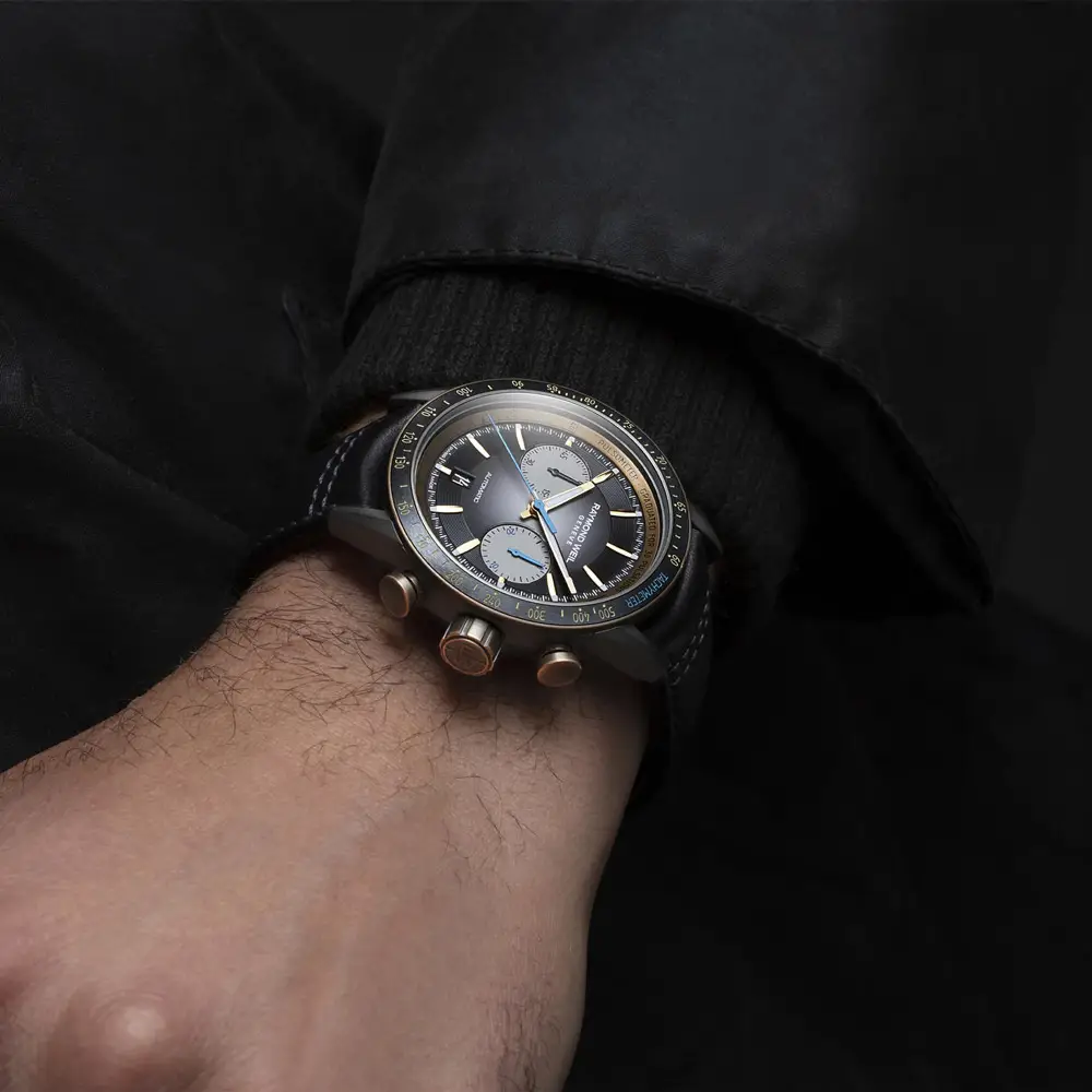 Raymond Weil Freelancer Bi-Compax 7780-TB3-20423 — это выдающиеся мужские часы, сочетающие винтажную эстетику, современные технологии и швейцарское мастерство. Корпус диаметром 43,5 мм, выполненный из титана и бронзы, дополнен чёрной керамической безелью и сапфировым стеклом с антибликовым покрытием. Чёрный градиентный циферблат с двумя счётчиками Bi-Compax и золотыми акцентами придаёт модели характер и спортивную элегантность.