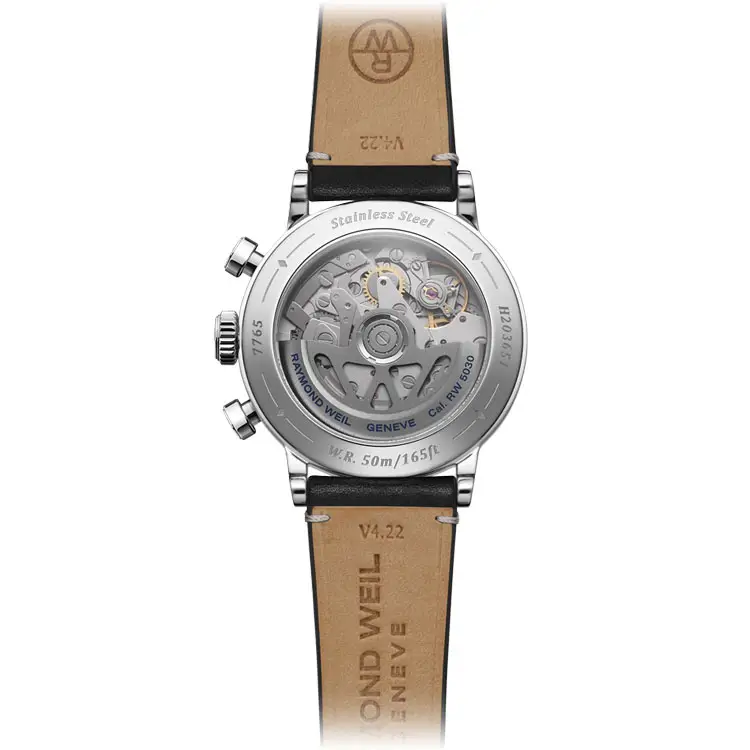 Raymond Weil Millesime 7765-STC-20001 — это мужской хронограф, объединяющий классический стиль и современные технологии. Корпус из нержавеющей стали диаметром 39,5 мм оснащён выпуклым сапфировым стеклом с антибликовым покрытием, создающим характерный эффект «glassbox» в духе 1950-х годов. Чёрный секторный циферблат с контрастными субциферблатами, тахиметрической шкалой и стрелками с люминесцентным покрытием обеспечивает превосходную читаемость.