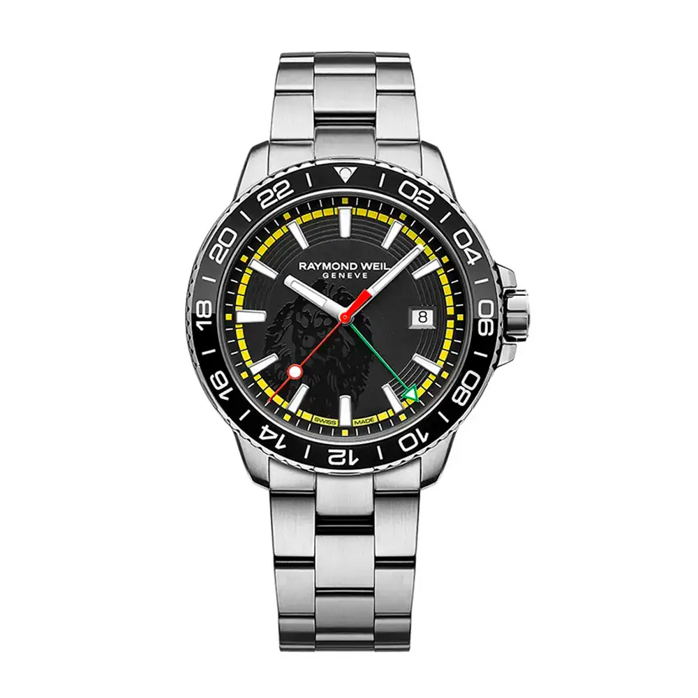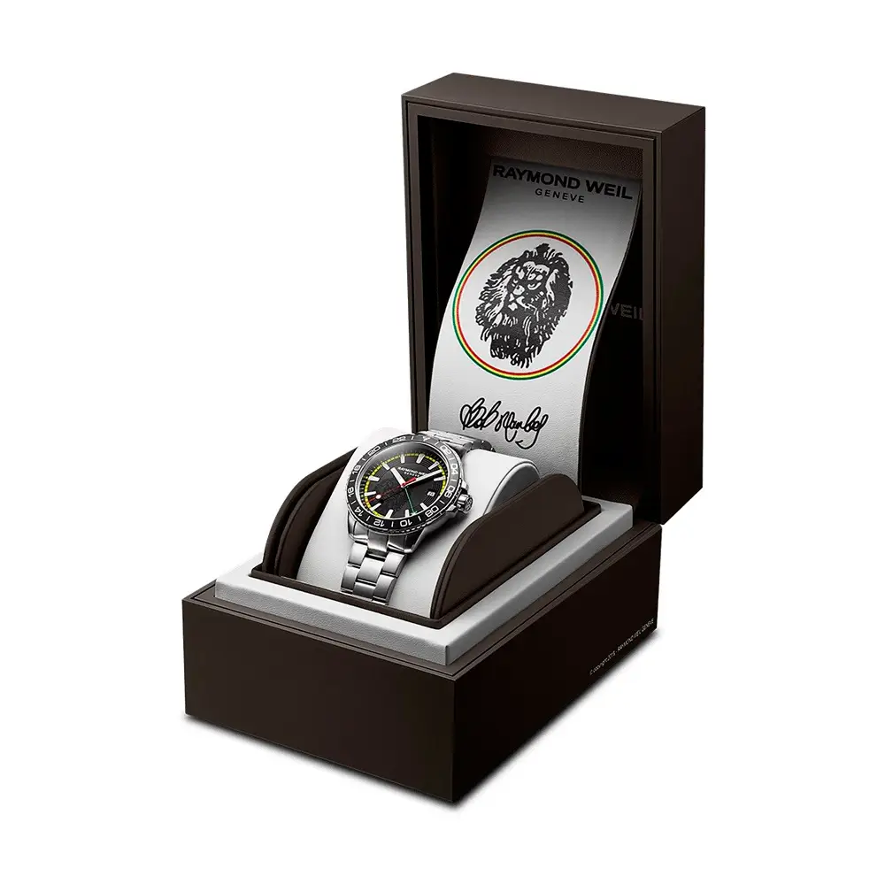 Raymond Weil Tango Bob Marley Limited Edition 8280-ST1-BMY18 — это часы, созданные в честь легендарного музыканта регги и символа свободы Боба Марли. Корпус из нержавеющей стали диаметром 42 мм оснащён двунаправленным вращающимся безелем с 24-часовой шкалой, а чёрный циферблат украшен изображением льва, вдохновлённым флагом Эфиопии, символом силы и единства. Акценты в красном, жёлтом и зелёном цветах напоминают о ямайских корнях и духе Марли. На задней крышке выгравированы подпись Боба Марли и надпись „Time Will Tell“, подтверждающие подлинность лимитированной серии в 1 500 экземпляров.