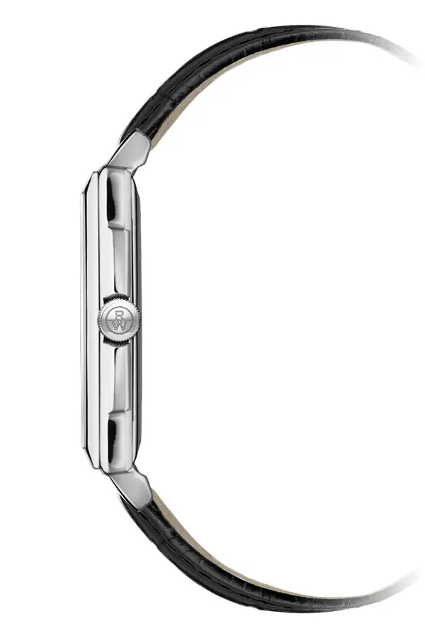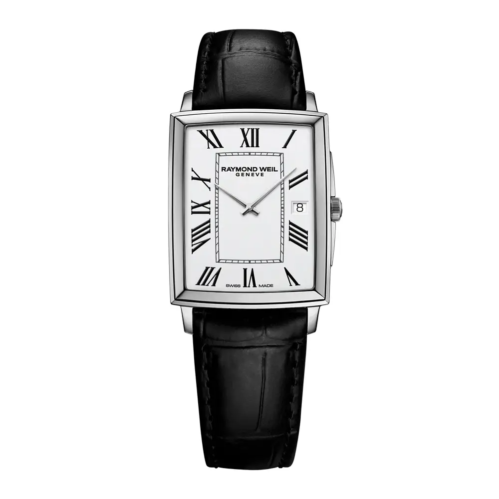 Raymond Weil Toccata 5425-STC-00300 сочетает классическую прямоугольную форму, минималистичную элегантность и швейцарскую точность. Корпус размером 37,25 × 29,60 мм выполнен из нержавеющей стали и оснащён сапфировым стеклом, устойчивым к царапинам, которое защищает белый циферблат с чёрными римскими цифрами и окном даты на отметке 3 часа.
