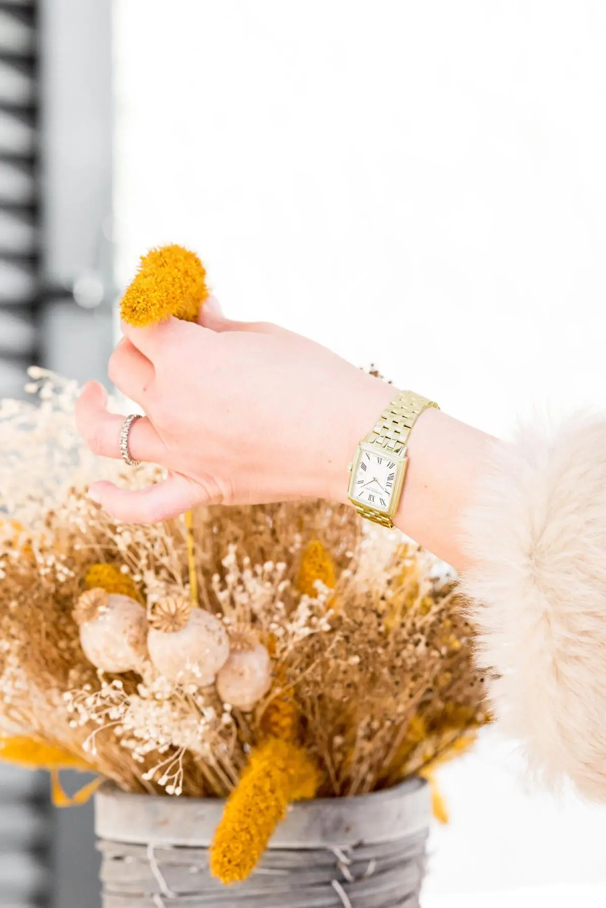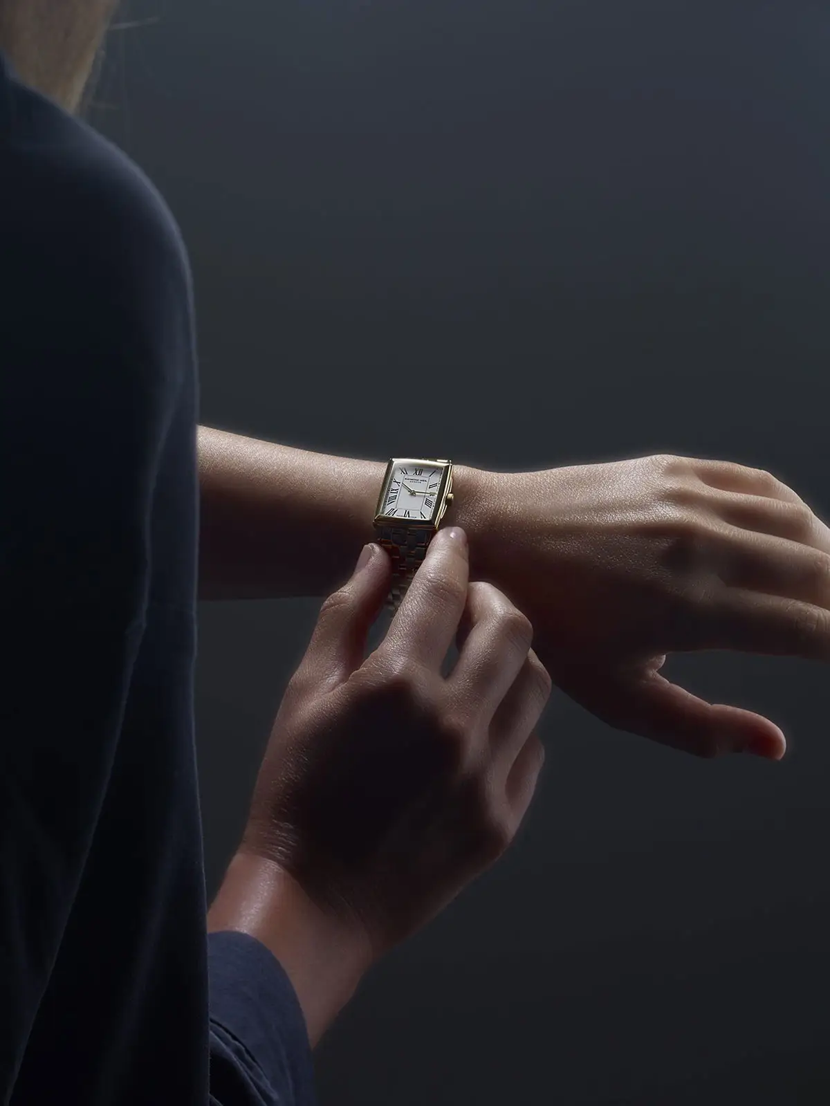 Raymond Weil Toccata 5925-P-00300 сочетает классический стиль ар-деко, изысканную элегантность и швейцарскую точность. Корпус размером 22,6 × 28,1 мм выполнен из нержавеющей стали с жёлтым PVD-покрытием и защищён сапфировым стеклом, устойчивым к царапинам. Белый циферблат с чёрными римскими цифрами и окном даты на отметке 3 часа подчёркивает утончённый и сдержанный характер модели.