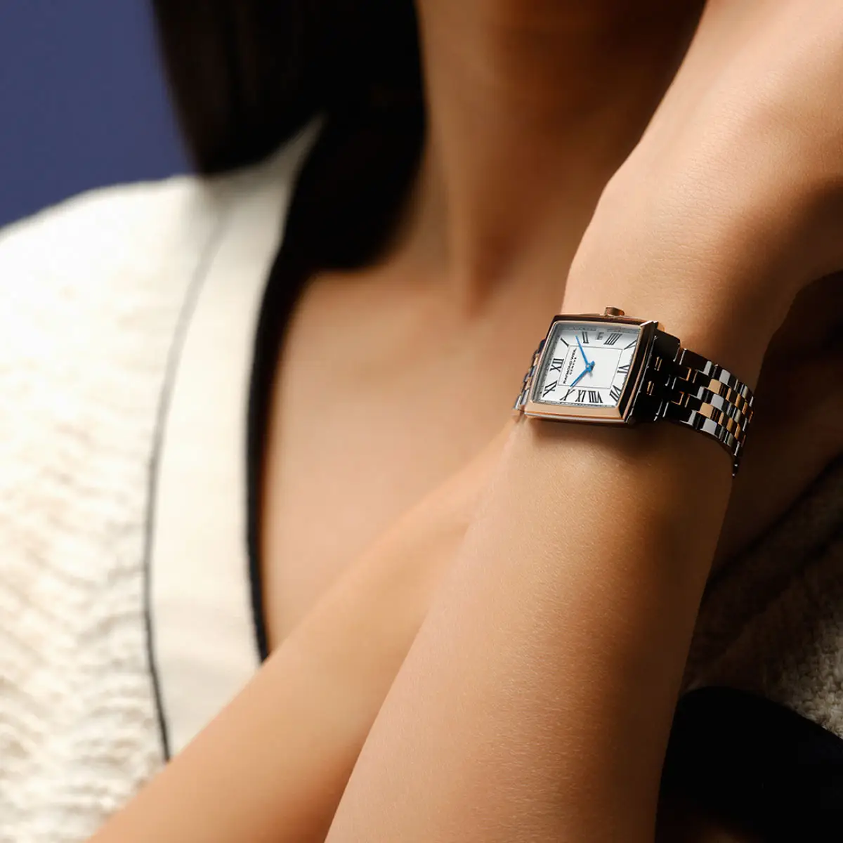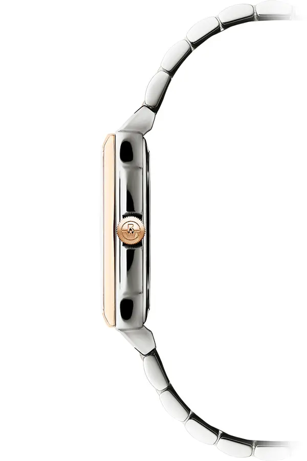 Браслет часов двухцветный, сочетающий нержавеющую сталь с розово-золотыми PVD звеньями, и застегивается раскладывающейся застежкой, обеспечивающей комфортное и безопасное ношение. Часы также имеют водонепроницаемость до 50 метров, что подходит для повседневного ношения и легкой активности в воде.