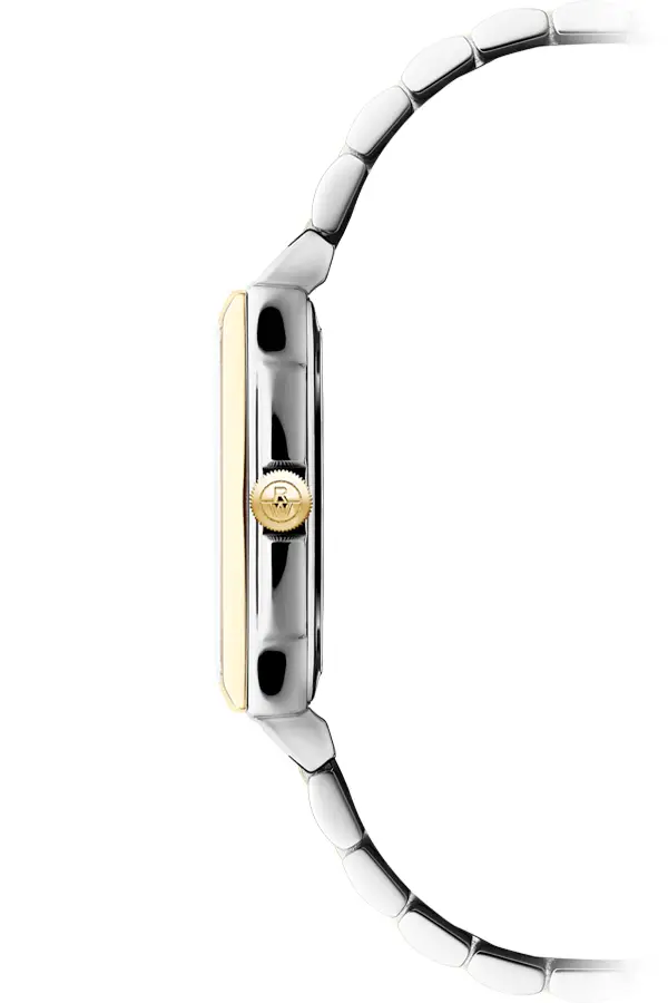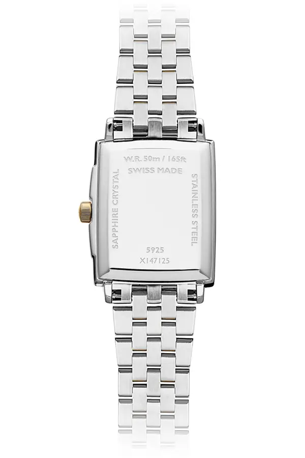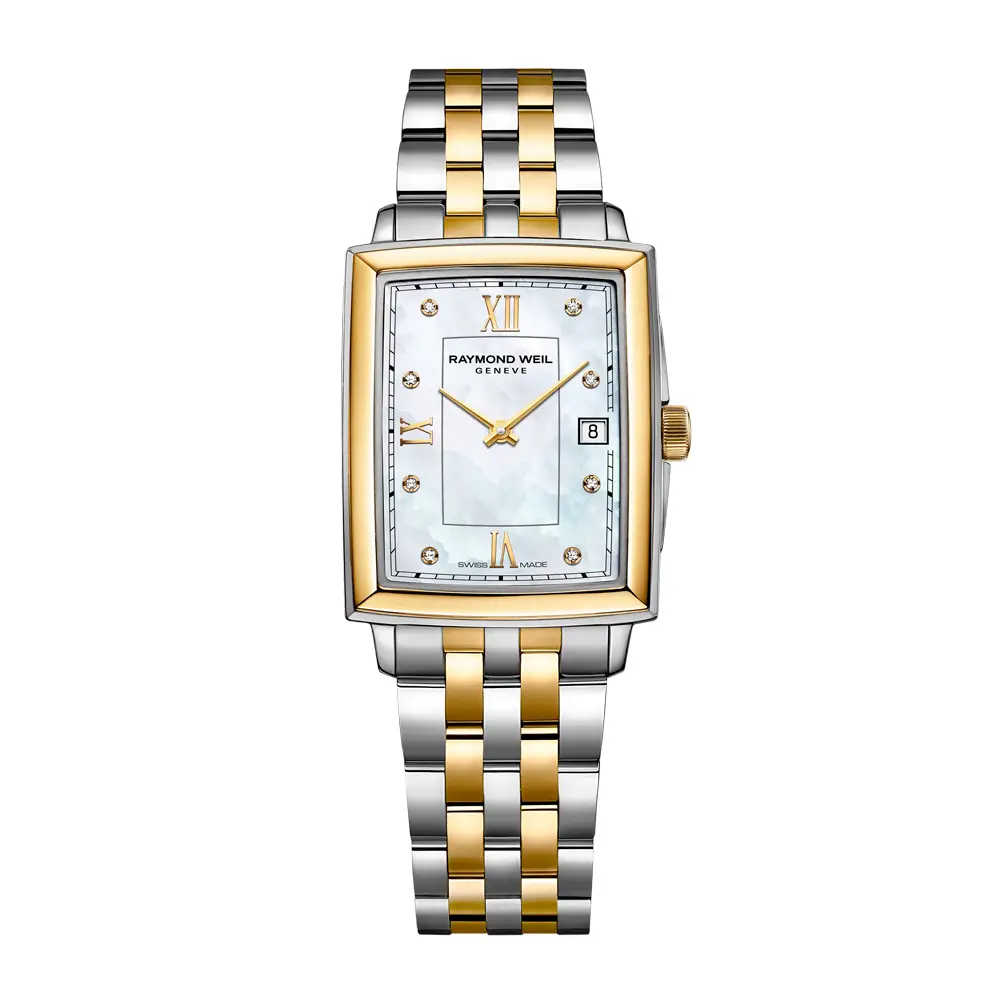 Raymond Weil Toccata 5925-STP-00995 сочетает в себе элегантность ар-деко, женственность и швейцарскую точность. Прямоугольный корпус размером 22,6 × 28,1 мм выполнен из нержавеющей стали с покрытием из жёлтого PVD-золота и защищён сапфировым стеклом, устойчивым к царапинам. Перламутровый циферблат украшен 8 бриллиантовыми метками и римскими цифрами, создавая изысканный и утончённый облик.