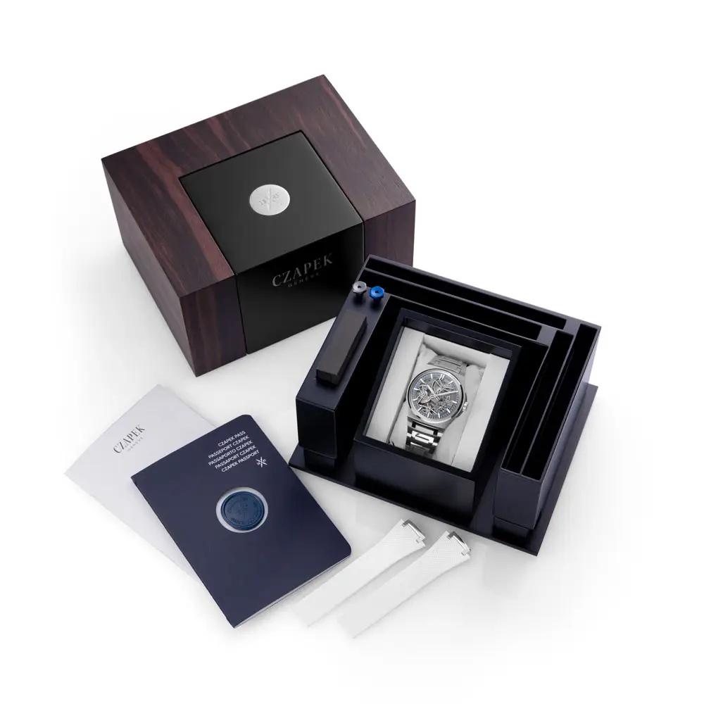 Часы оснащены практичной функцией даты и элегантной раскладной застёжкой, надёжно фиксирующей ремешок на запястье. Czapek Antarctique Révélation предназначены для истинных ценителей часового искусства, которые ищут сочетание технического совершенства, яркого дизайна и повседневной функциональности. Эта модель — не просто часы, а носимое произведение искусства, раскрывающее тайны времени.
