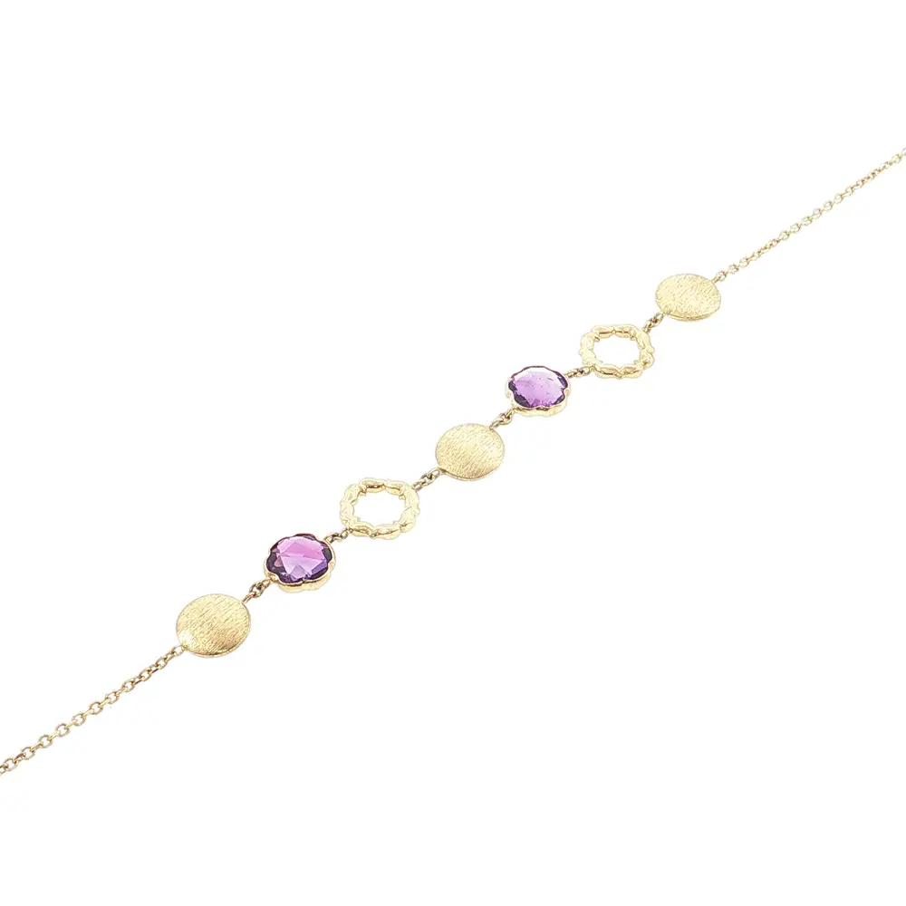 Роскошное колье из золота 14 карат с фиолетовыми камнями — это элегантное украшение, которое привлекает внимание своим утонченным дизайном и изысканным блеском. Сочетание настоящего золота 14 карат и сияющих фиолетовых камней придает изделию вневременной стиль, подходящий как для повседневной носки, так и для особых случаев.