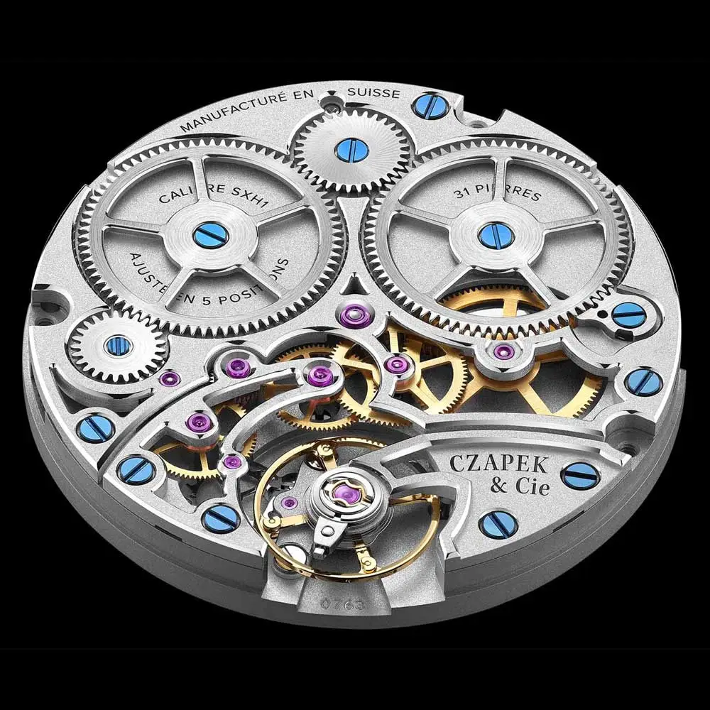 В сердце часов работает мануфактурный калибр SXH1 с ручным заводом, обладающий впечатляющим запасом хода 168 часов (7 дней) и частотой 21 600 пк/ч (3 Гц). Его изысканные детали и ручная отделка видны сквозь прозрачную сапфировую заднюю крышку.