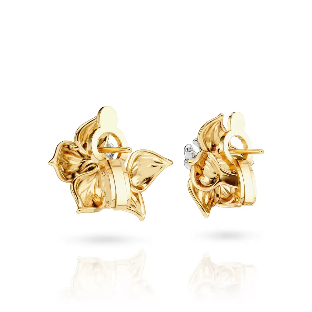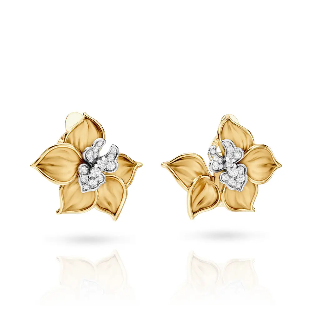 Серьги Carrera y Carrera Orquídeas Maxi из коллекции Orquídeas от Carrera y Carrera представляют собой высокоточно выполненное ювелирное изделие, вдохновлённое формой цветущей орхидеи. Украшение изготовлено из жёлтого и белого золота 18 карат, что обеспечивает долговечность и визуальный контраст. Центральным элементом является скульптурно проработанный мотив орхидеи, отличающийся тонкой детализацией лепестков.