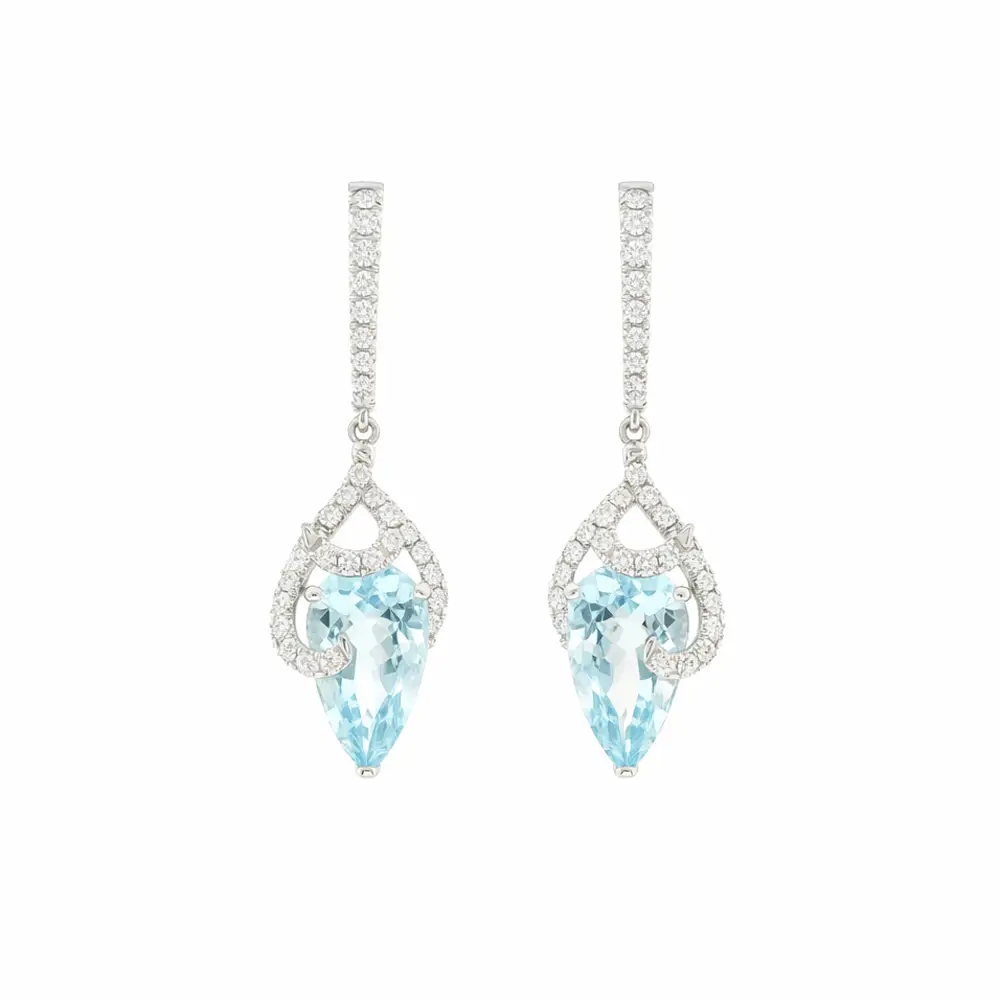 Элегантные серьги из белого золота с аквамаринами и бриллиантами впечатляют своим изящным дизайном и ярким блеском. Центральными элементами являются натуральные аквамарины общим весом 5,06 карата, чей нежно-голубой оттенок напоминает чистоту морской воды. Их дополняют сияющие бриллианты общим весом 0,70 карата, качество G/VS, усиливающие блеск и элегантность украшения.