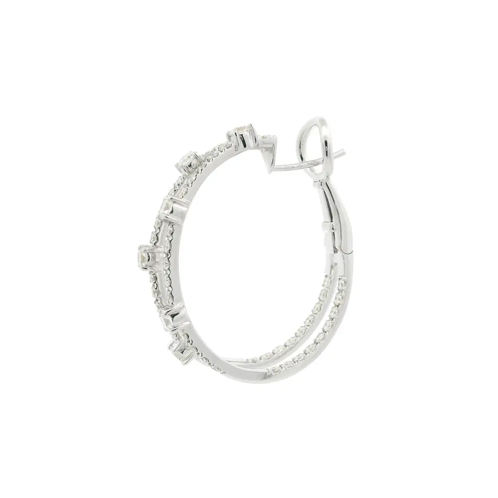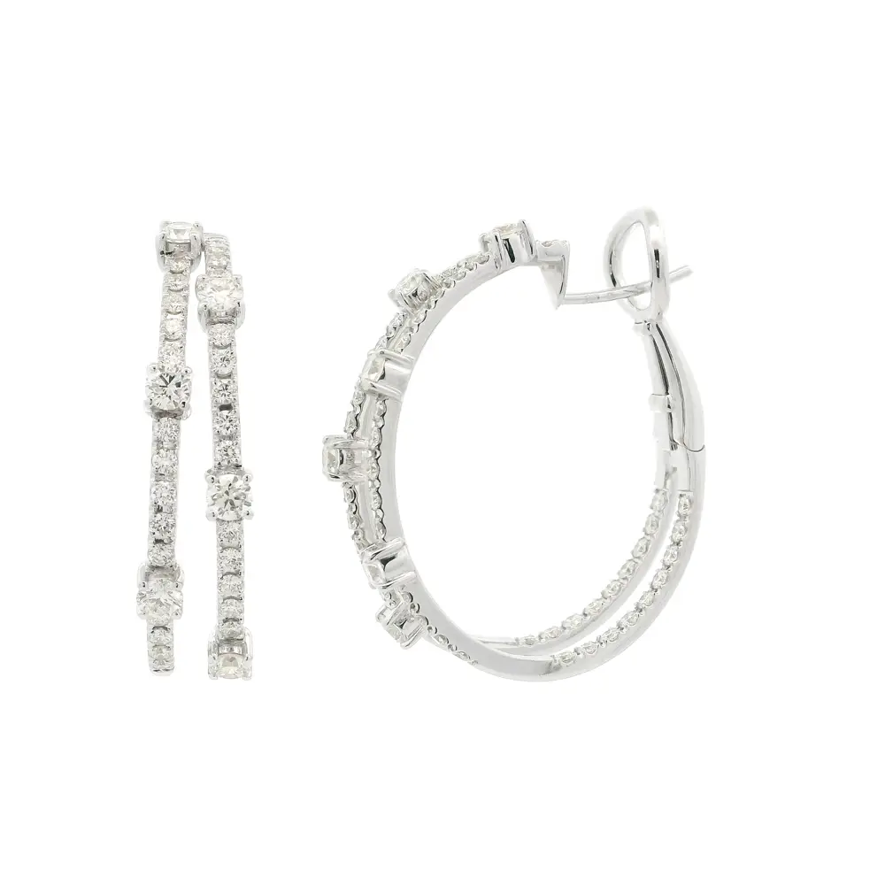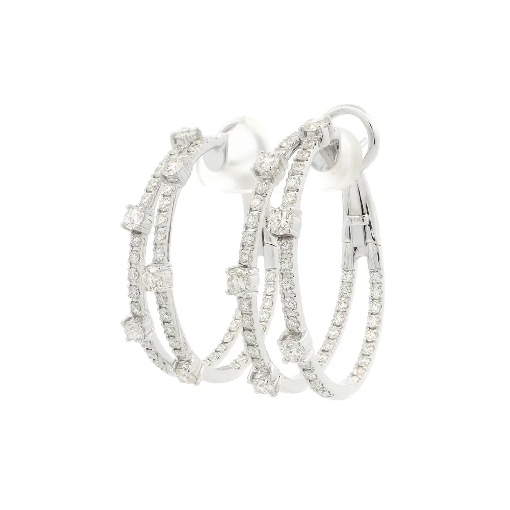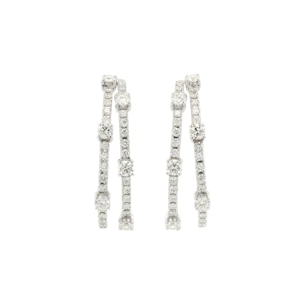 Эти изысканные серьги из белого золота 18 карат очаровывают утончённым блеском и плавными линиями. Двойной кольцевой дизайн, украшенный бриллиантами разного размера, создаёт впечатляющую игру света и глубину.