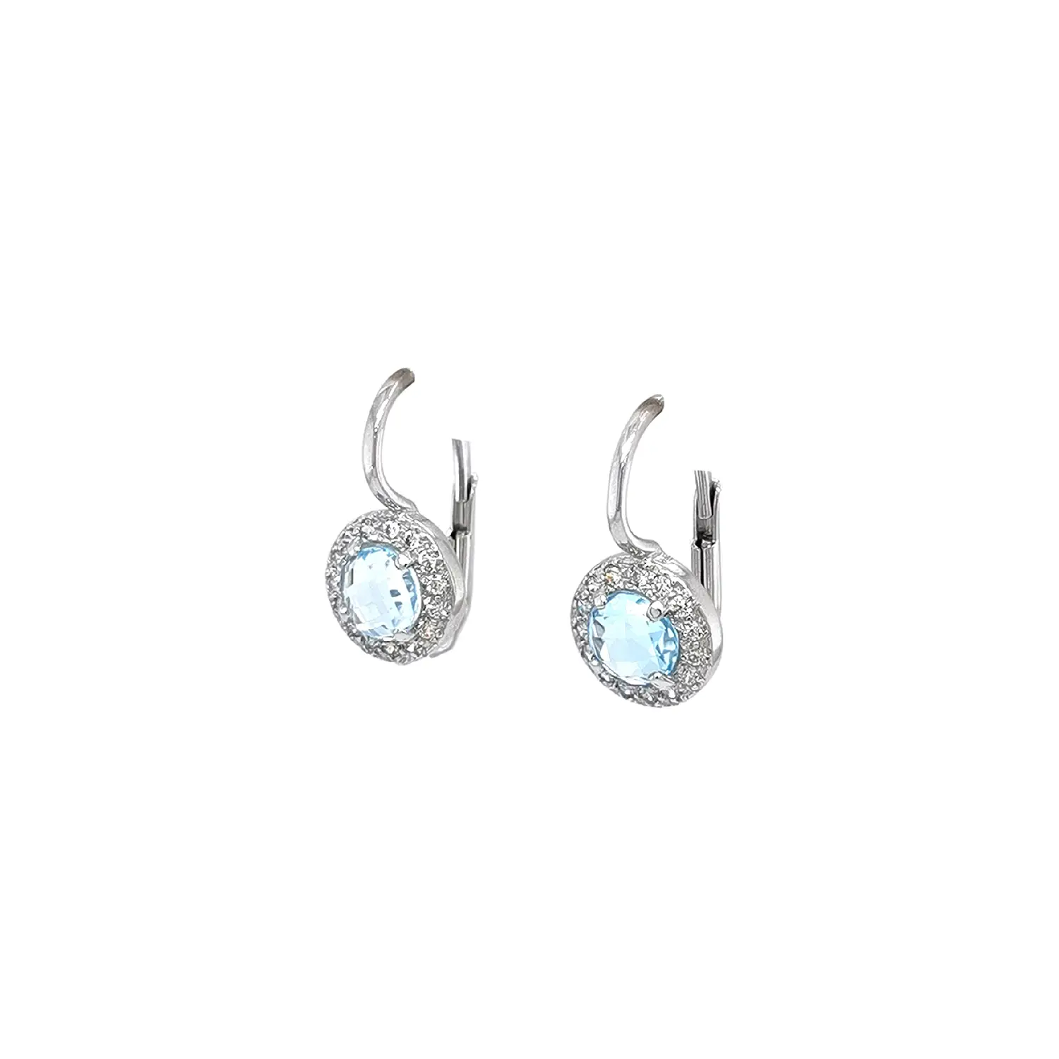 Эти изысканные серьги из белого золота восхищают мягким, но выразительным сиянием, подчеркнутым центральными голубыми топазами с их чистым, светлым небесным оттенком. Каждый камень заключён в круглую оправу и окружён сверкающим паве из цирконов, что усиливает блеск и подчёркивает цвет центрального минерала.