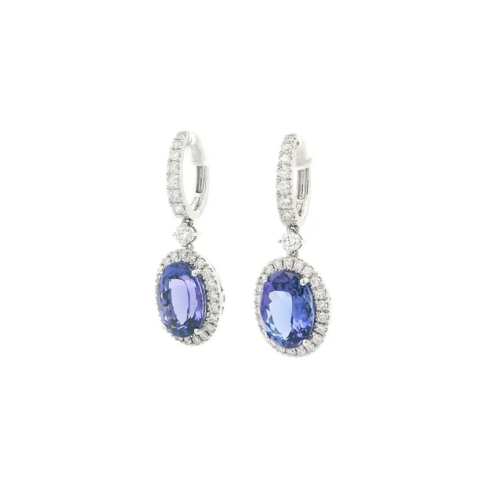 Эти серьги из 18-каратного белого золота воплощают изысканную элегантность и утончённость. В центре — овальные танзаниты насыщенного фиолетово-синего оттенка, обрамлённые бриллиантами круглой огранки, создающими ореол света.