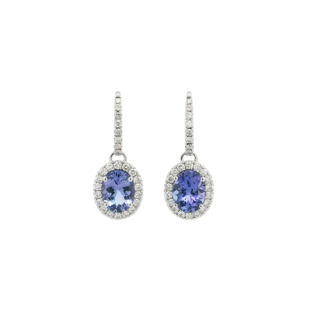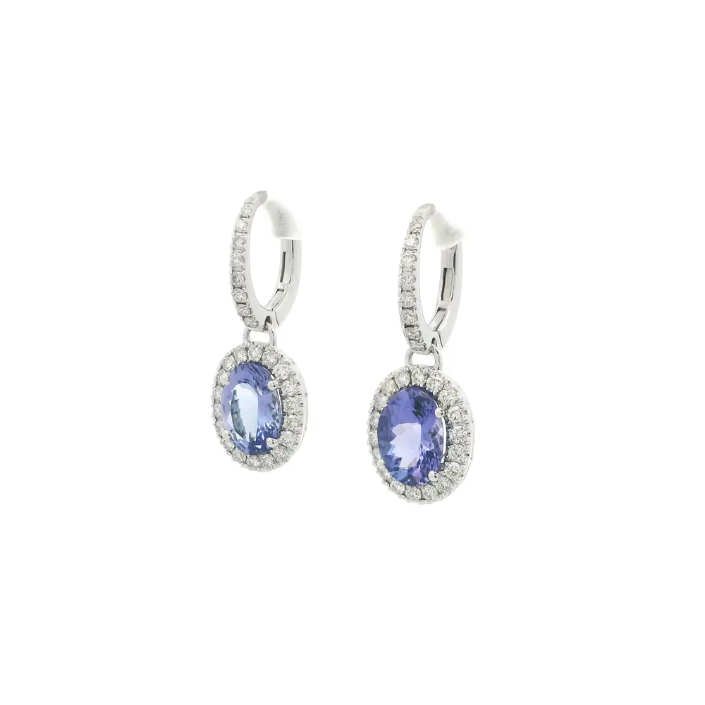 Эти серьги из 18-каратного белого золота поражают изяществом и роскошным блеском. В центре композиции — овальные танзаниты, переливающиеся оттенками синего и фиолетового, обрамлённые сияющими бриллиантами.