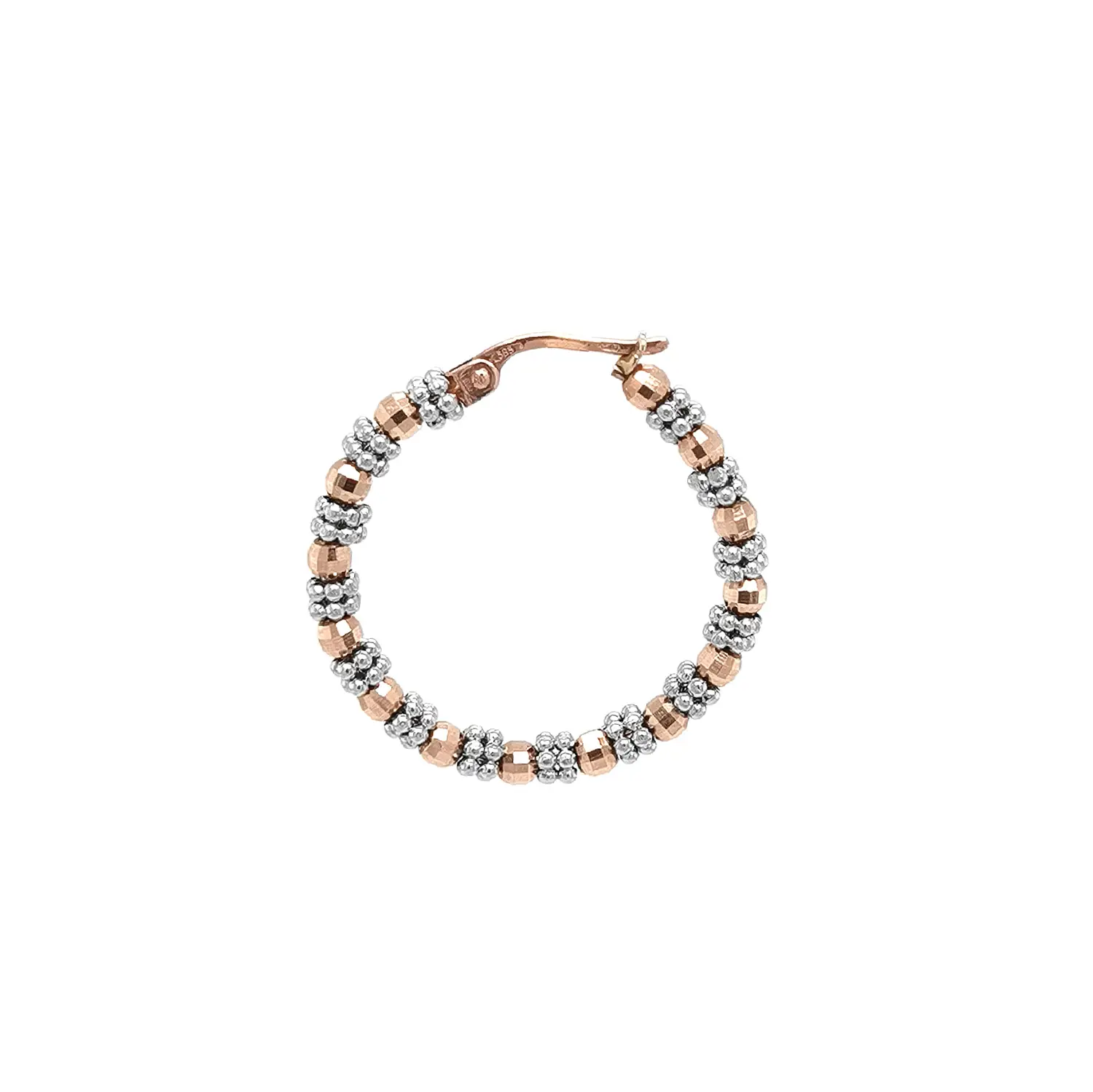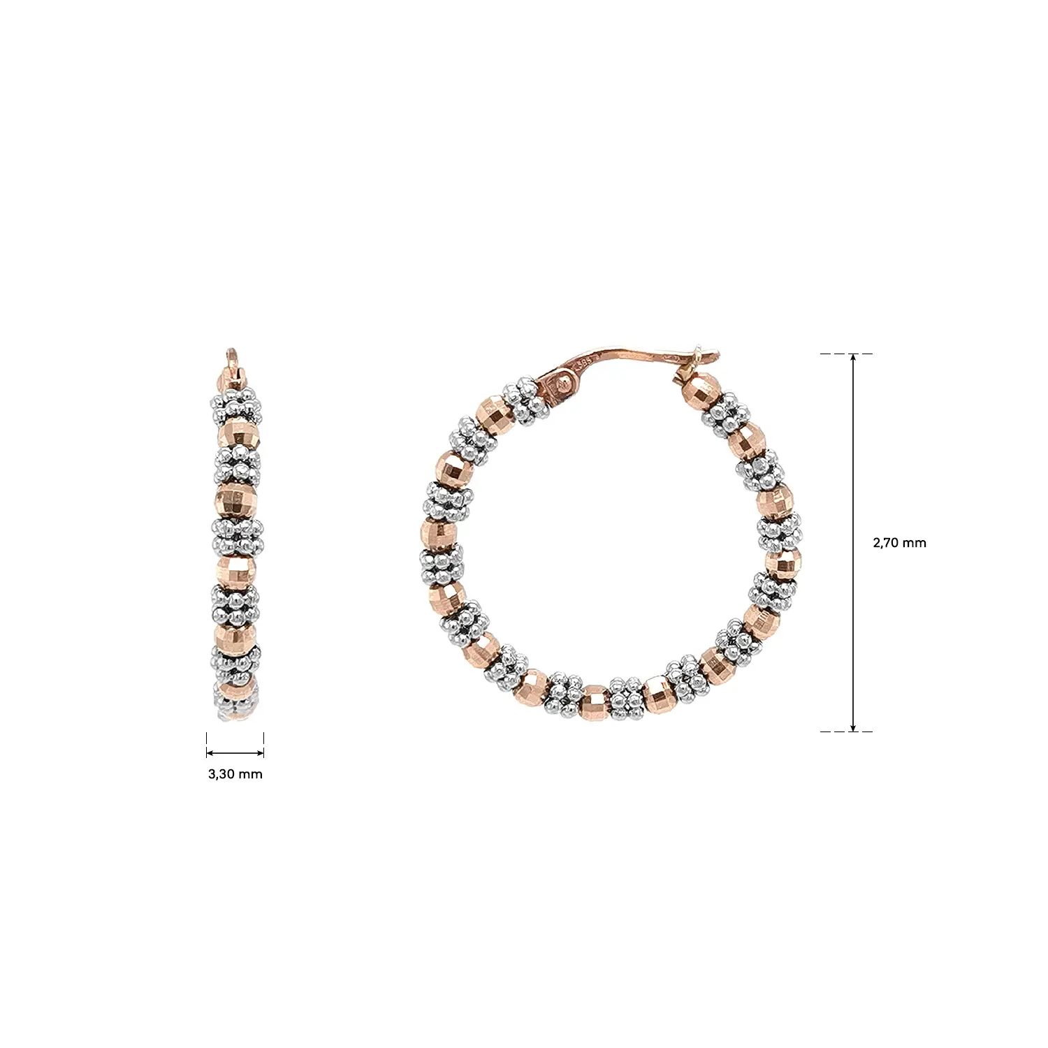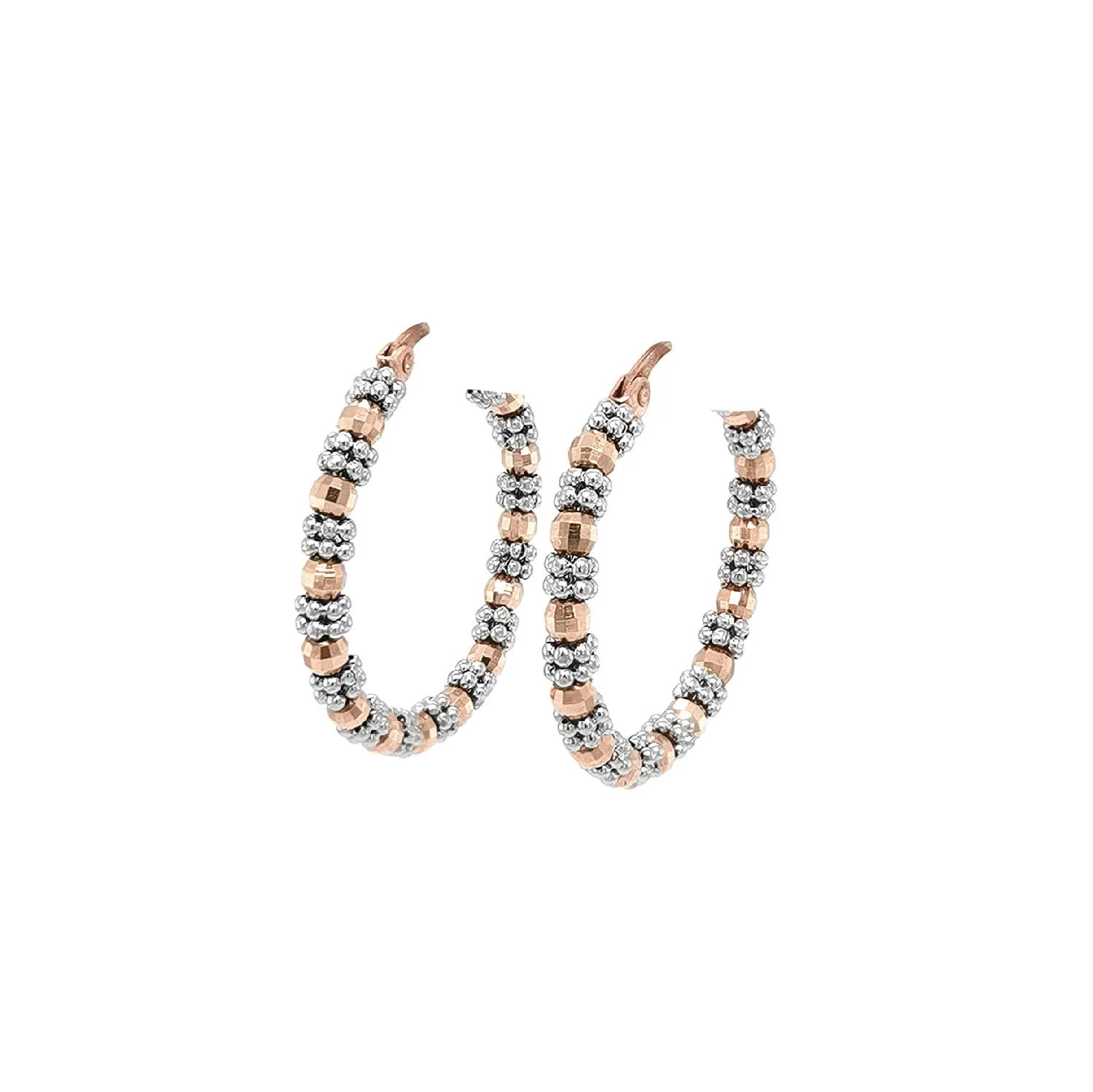 Эти элегантные кольцевые серьги выполнены из розового и белого золота и украшены детализированным бусинным узором, сочетающим блестящие розовые шарики и текстурированные элементы из белого золота. Изысканная структура придаёт изделию современный и утончённый вид.