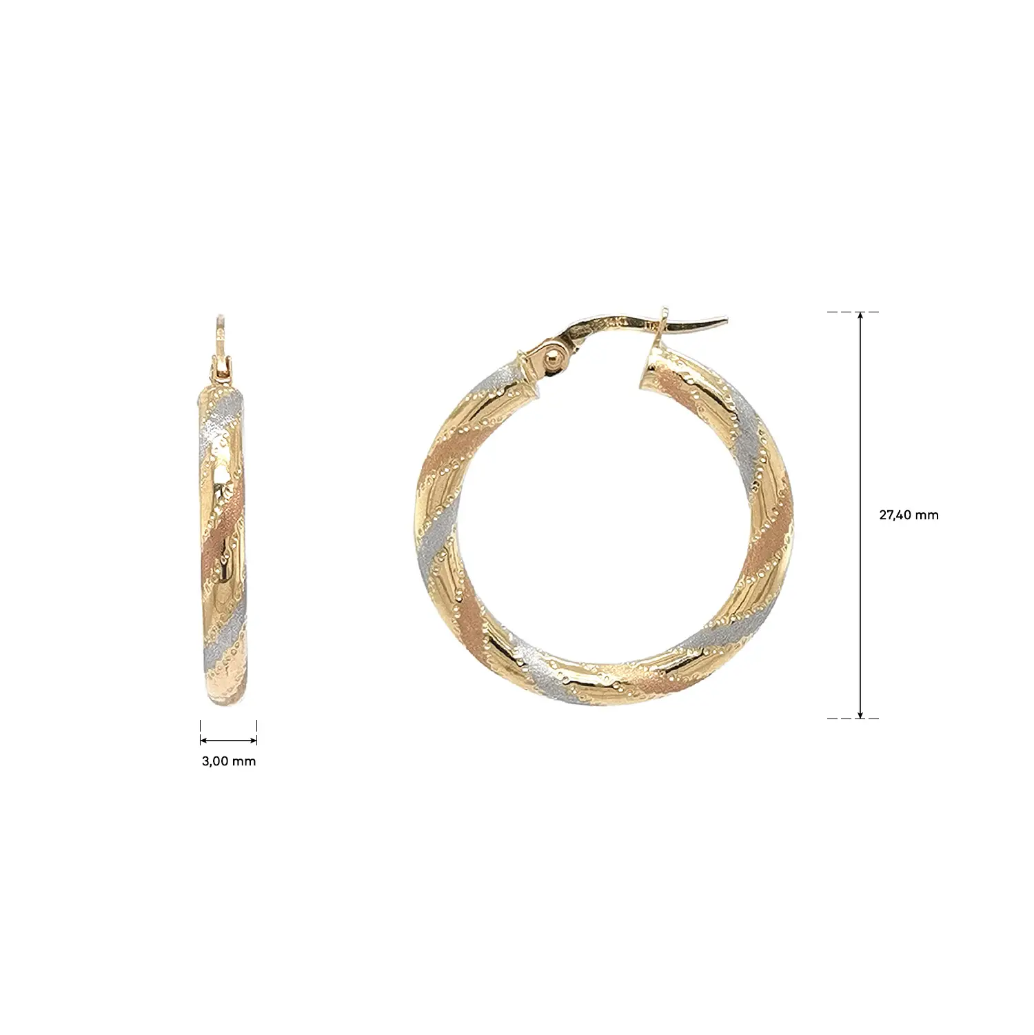 Серьги-кольца из трёхцветного золота с матовой и полированной отделкой