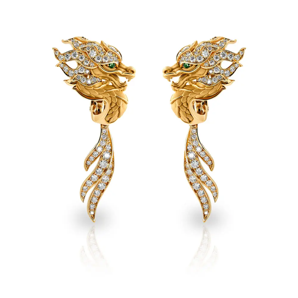 Яркая деталь - четыре зеленых бриллианта общим весом 0,07 карата, которые служат глазами дракона и придают драгоценности уникальный вид - яркий, мощный и неповторимый. Изящный изгиб "гривы дракона" создает элегантное продолжение вниз, благодаря чему серьги выглядят динамично и чувственно.