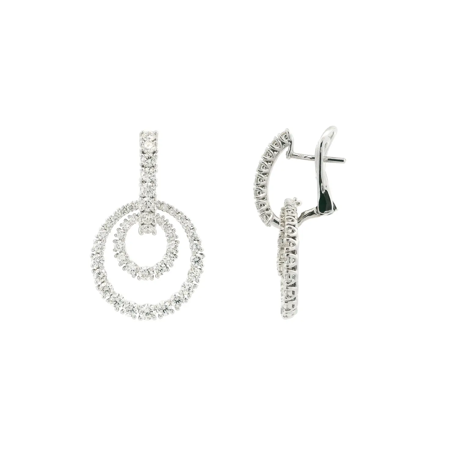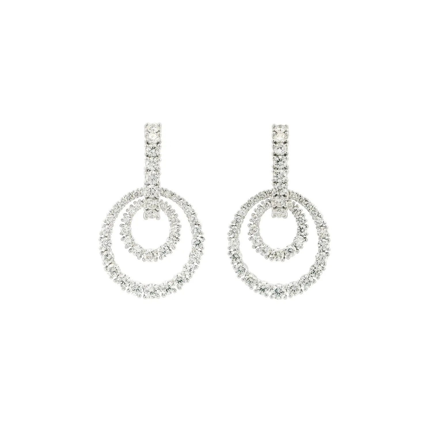 Эти роскошные серьги из белого золота впечатляют архитектурным дизайном из двойных кругов, полностью украшенных бриллиантами огранки «бриллиант». Изящный силуэт позволяет кругам легко двигаться при каждом движении, создавая завораживающую игру сияния и современной элегантности.