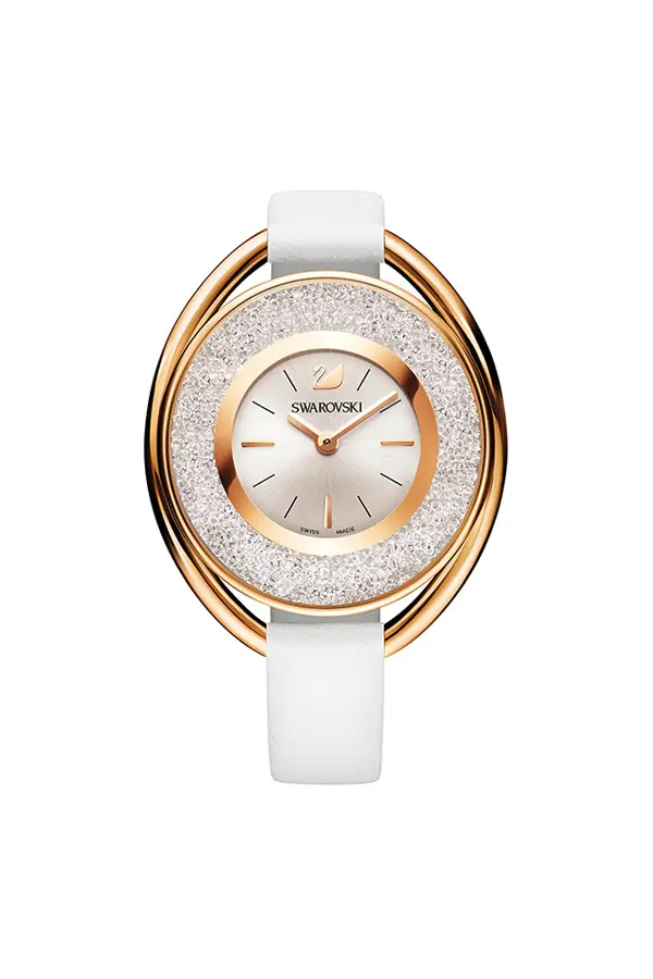 Модель женских часов из коллекции Crystalline Oval отдаленно напоминает глаз. В центре белого циферблата расположены концентрические круги, обрамленные лентой из розового золота с 1 700 прозрачными кристаллами Swarovski. Овальный ободок закреплен на белом кожаном ремешке.