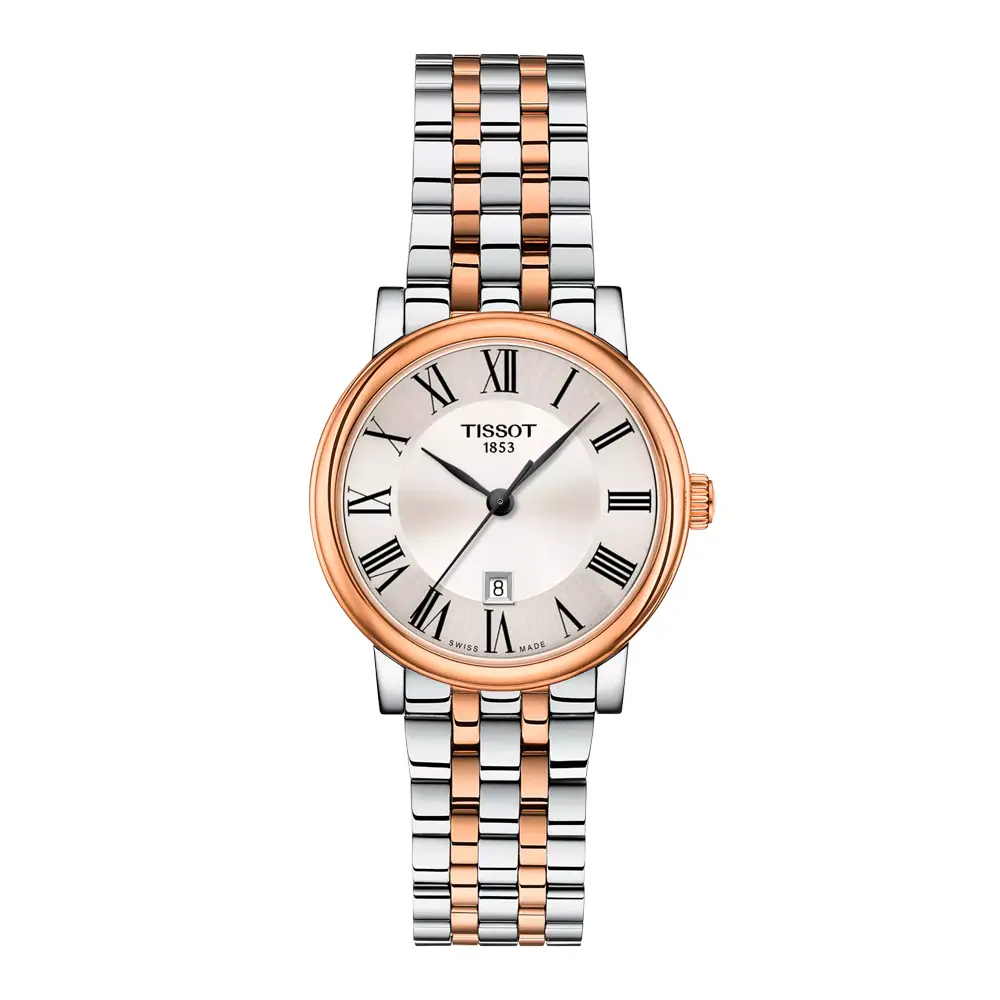 Tissot Carson Premium Lady T122.210.22.033.01 объединяет классическую элегантность, современные детали и швейцарскую точность. Корпус диаметром 30 мм изготовлен из нержавеющей стали 316L с розовым PVD-покрытием и защищён сапфировым стеклом, устойчивым к царапинам. Серебристый циферблат украшен римскими цифрами, утончёнными стрелками и окном даты на отметке 3 часа.