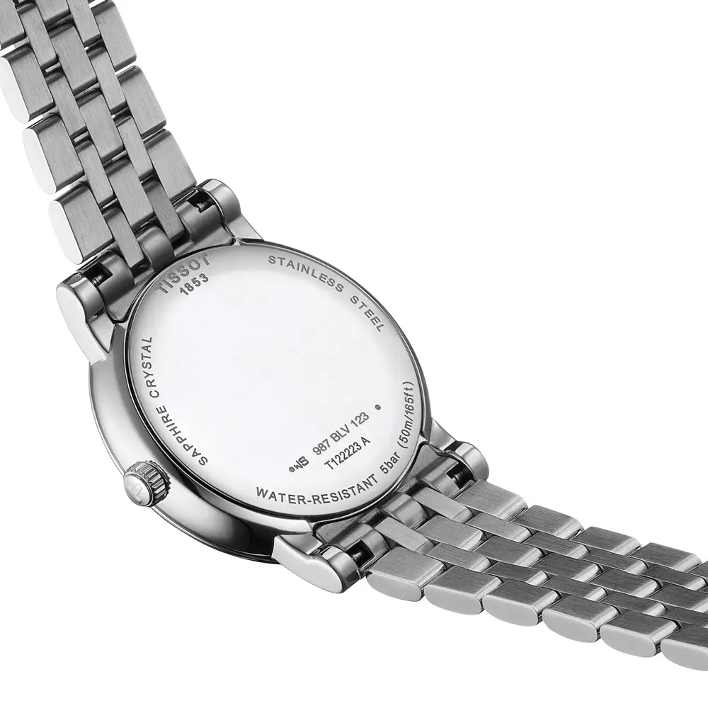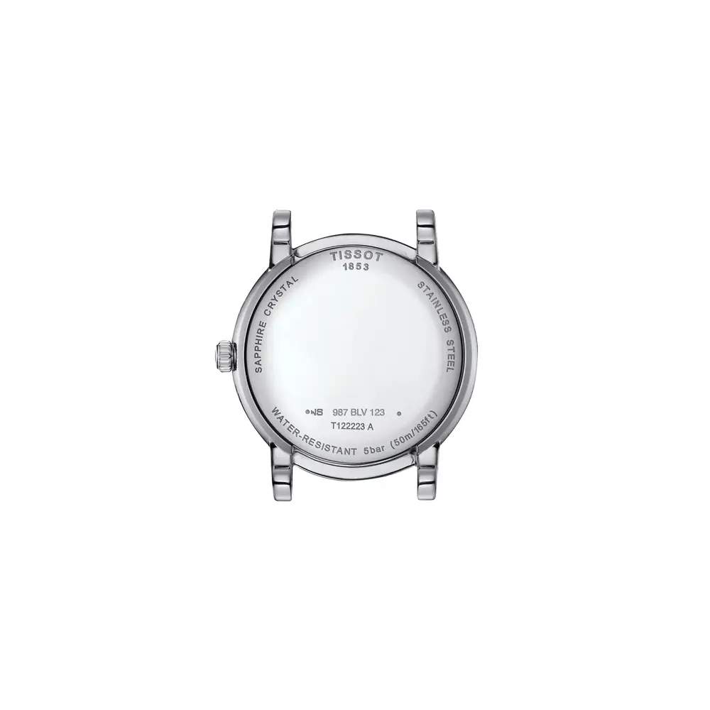 Внутри установлен швейцарский кварцевый механизм ETA F05.841, известный своей надёжностью и минимальными требованиями к обслуживанию. Модель оснащена датой и функциональным индикатором EOL, предупреждающим о необходимости замены батареи. T122.223.11.033.00 представляет собой гармоничное сочетание женственной элегантности, высокого качества и практичных усложнений, идеально подходящее для женщин, ценящих и красоту, и функциональность.