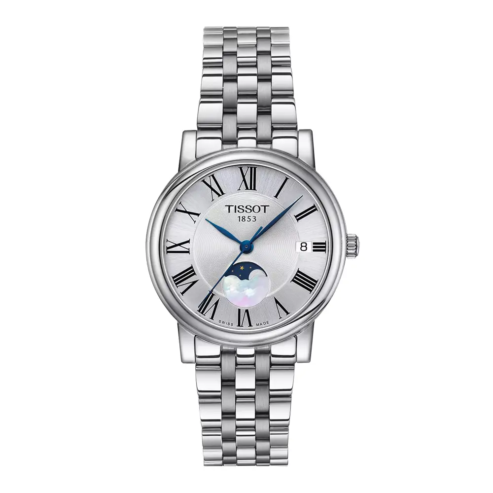 Tissot Carson Premium Lady Moonphase сочетает утончённую эстетику, вечную элегантность и швейцарскую точность, благодаря чему подходит как для повседневного ношения, так и для особых случаев. Корпус 32 мм из стали 316L обрамляет изящный серебристый циферблат с римскими цифрами и синеватыми стрелками, создавая гармоничный и классический образ. Стальной браслет придаёт модели изысканный и женственный характер.