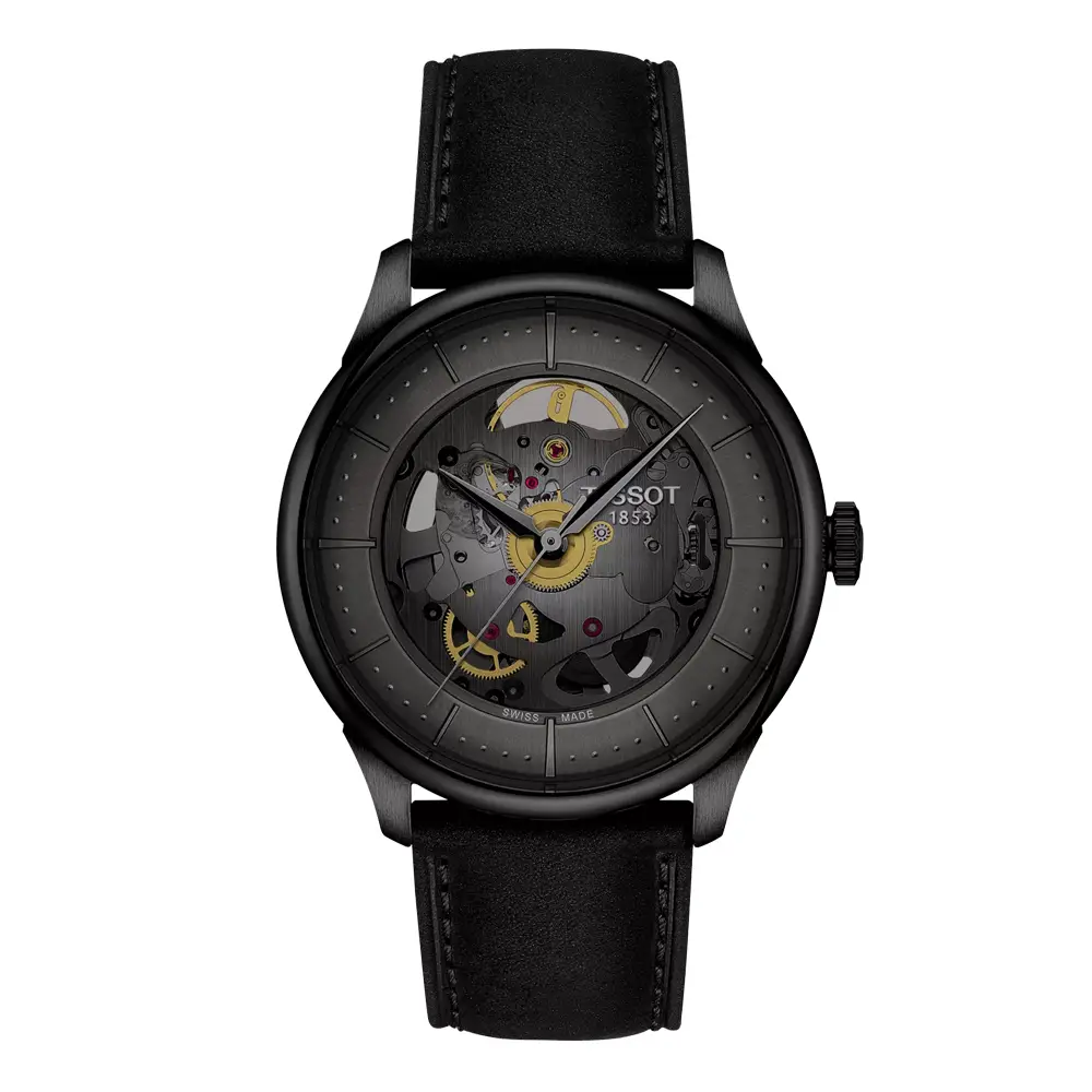 Модель Tissot Chemin des Tourelles Squelette представляет современное и выразительное прочтение традиционного швейцарского часового искусства. Её скелетонизированный циферблат открывает вид на механическое сердце часов, подчёркивая точность и красоту каждой детали. Элегантный стиль дополняет корпус 39 мм из нержавеющей стали 316L с чёрным PVD-покрытием, создающий эффектное сочетание классики и современности.