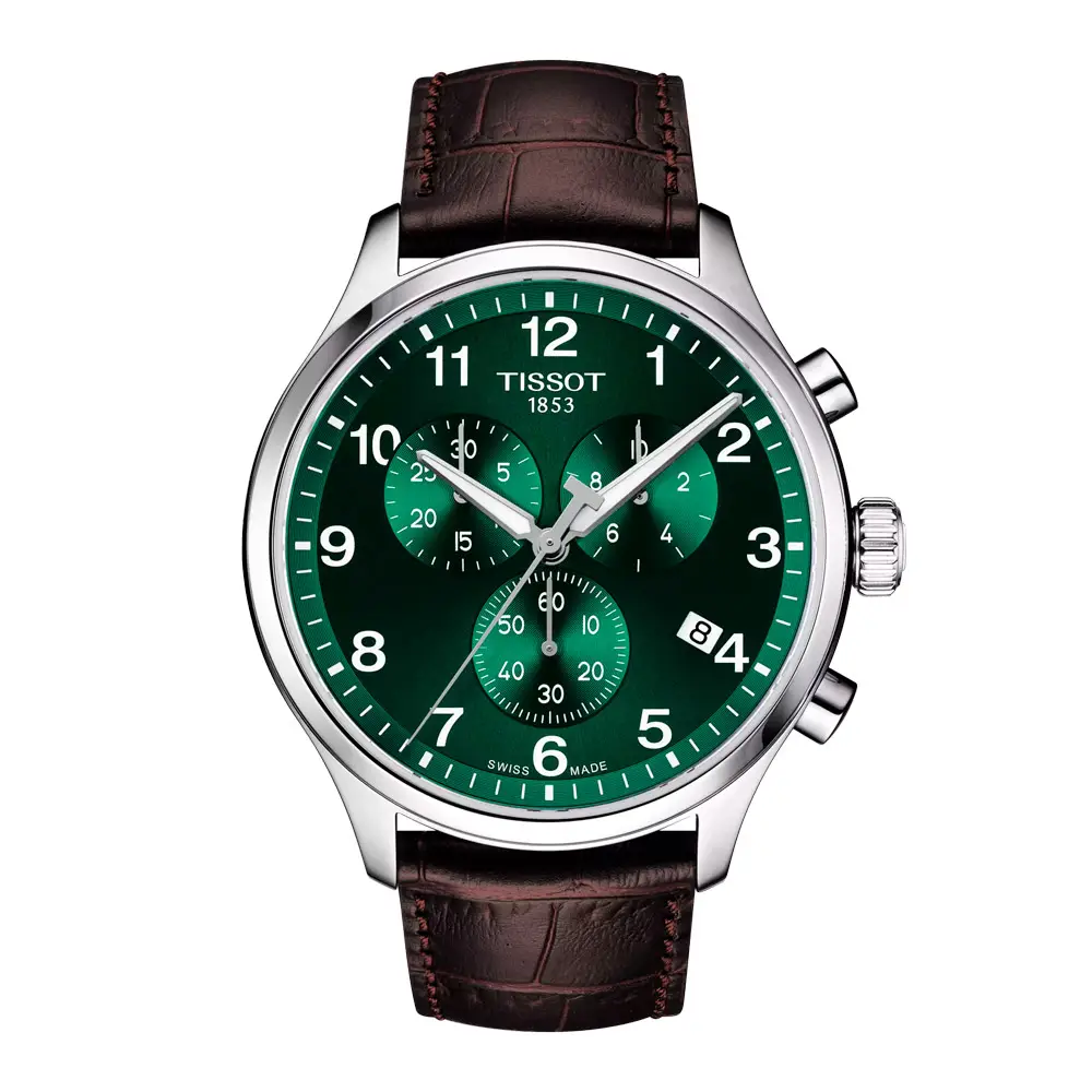 Tissot Chrono XL Classic — это выразительные мужские часы, сочетающие спортивную элегантность и практичные функции. Модель оснащена крупным корпусом из нержавеющей стали диаметром 45 мм, зелёным циферблатом с солнечным узором и коричневым кожаным ремешком с классической застёжкой. Стрелки и метки с покрытием Super-LumiNova® обеспечивают отличную читаемость даже в темноте.